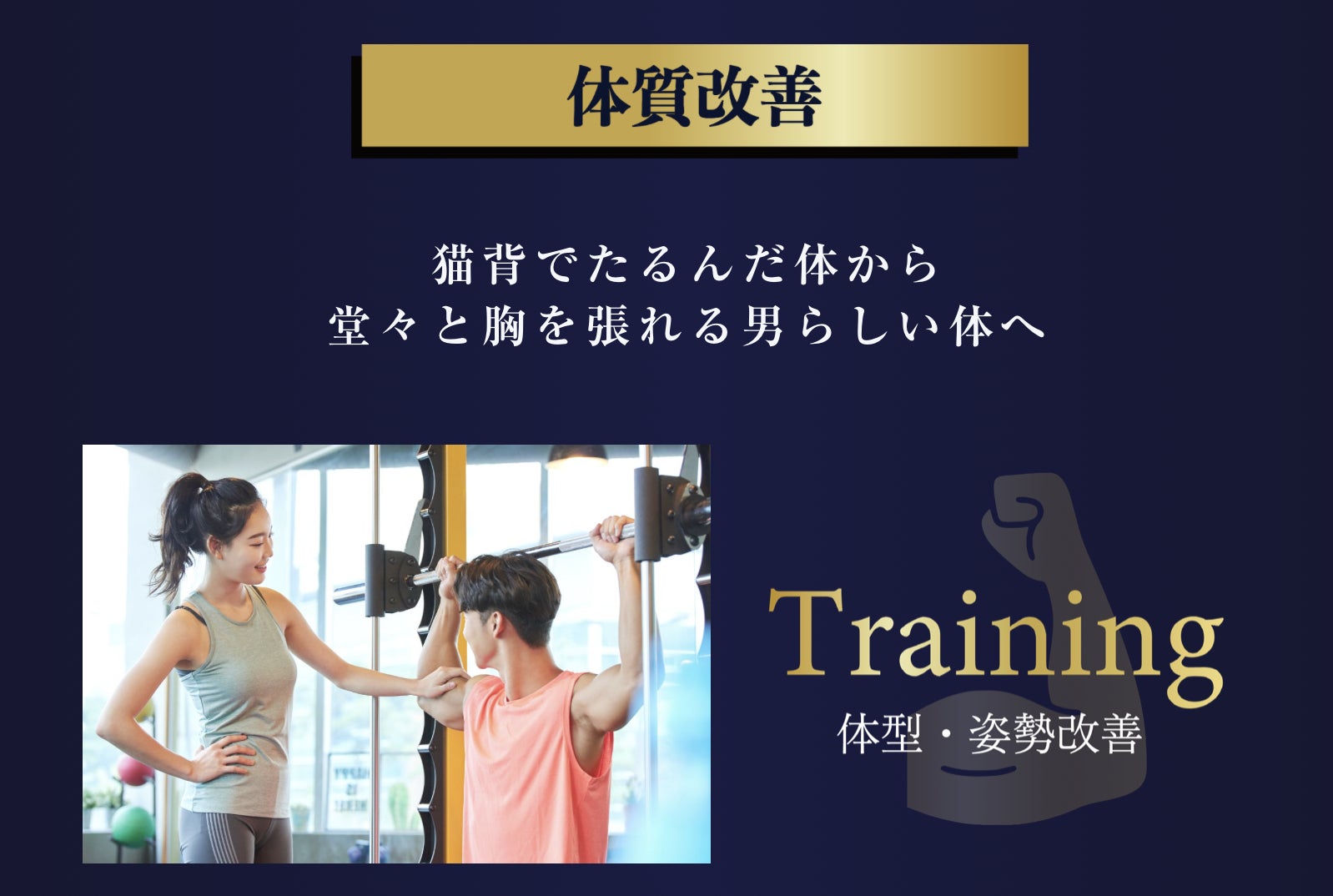 ジムトレーニングとオンライントレーニングを通じてまずは体型・姿勢を改善します