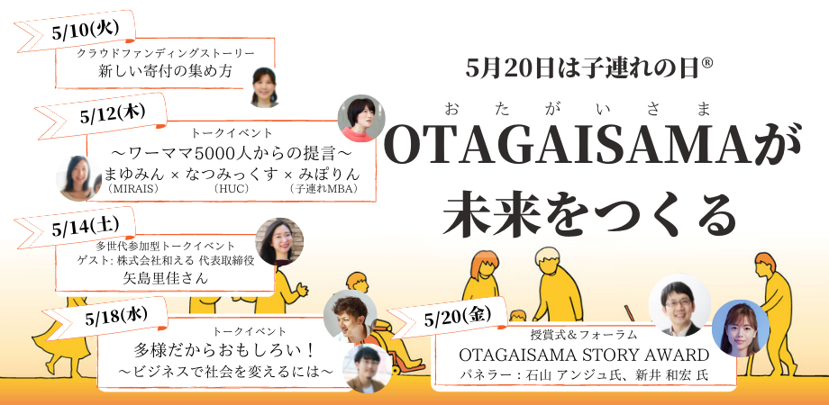 また、みなさまのご支援により、5/20子連れの日の授賞式はじめ、「おたがいさま」を体現されている素晴らしいゲストによるイベント全て無料で参加いただけます!ぜひご参加ください!