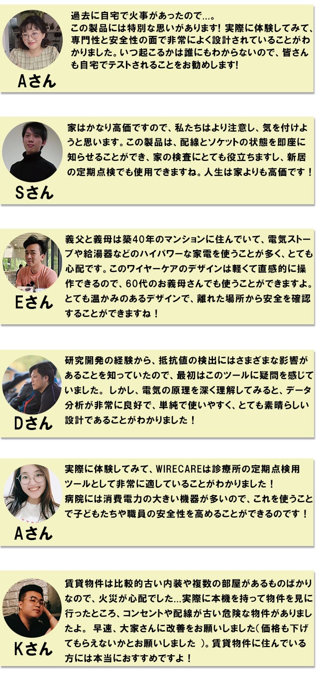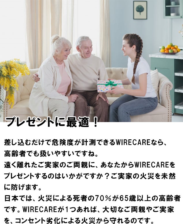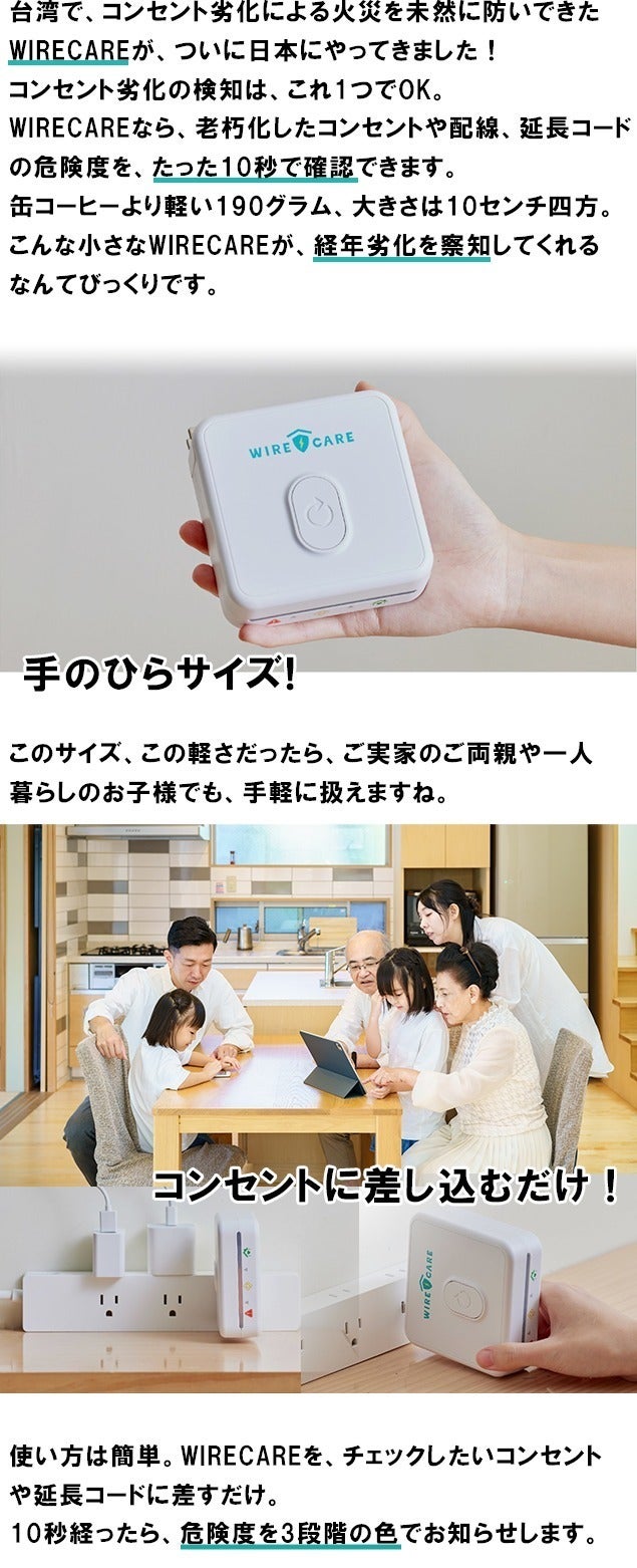 電気系統の不備を原因とする火災は跡を絶ちません。一度火災になれば、大切ものをすべて失ってしまいます。そうなるまえに、ぜひWIRECAREを一家に一台備えていただければと考えております。