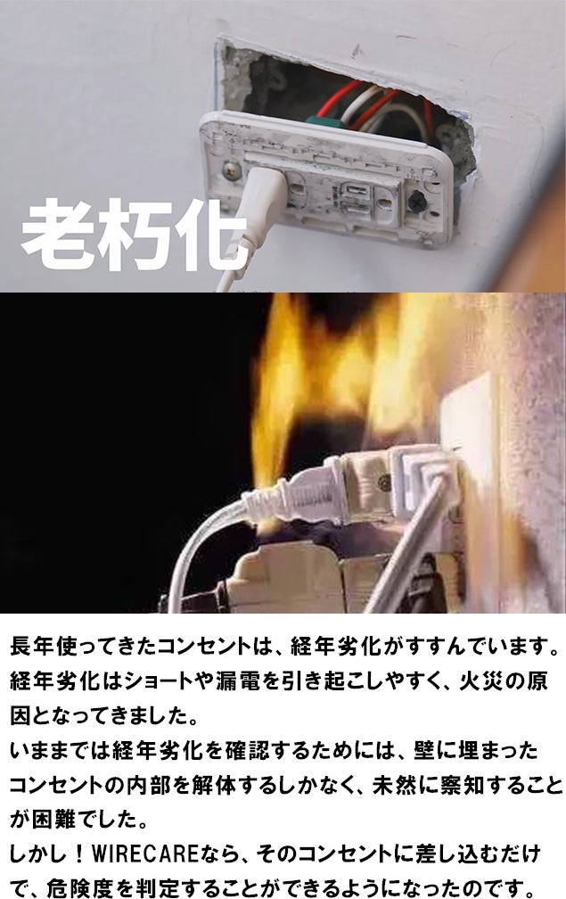 総務省消防庁による最新の火災統計では、配線設備が原因の火災が約11.7%となっており、 あまり高くない印象を受けるかもしれません。他の主要な要因は、コンロ、たばこ、放火です。 放火をのぞき、目視可能な原因であり、気を付ければ回避できるものです。一方、コンセントの内側は蓋をあけないと目視できず、定期的に電気技術者によるチェックが必要になり、費用もかさみます。また、火災は大切な人命・資産・思い出を一瞬にして奪うものであり、万が一でもあってはならないものです。 WIRACAREは、目に見えないコンセントの裏側の劣化を簡単にチェックするツールです。このツールを使用して、定期的にコンセントの劣化状態をチェックすることをおすすめいたします。