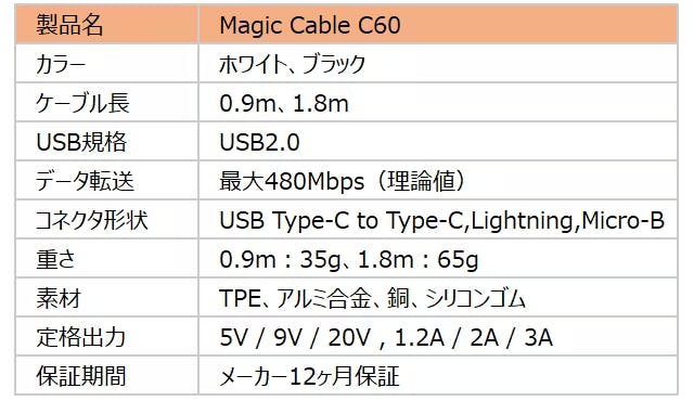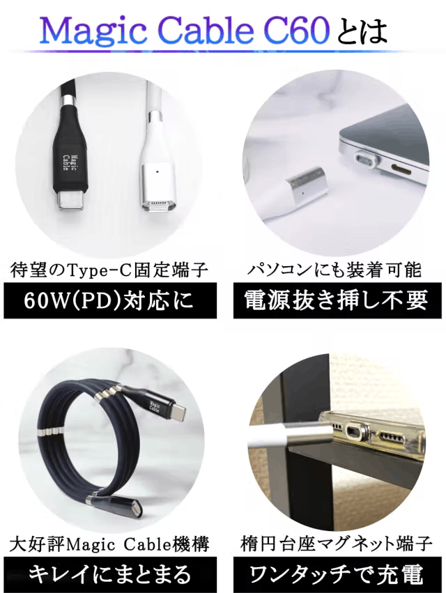 ①60W対応。Type-C固定端子採用。パソコン・iPhone・Androidもこれ1本で充電可能に! ②3種類のマグネット端子付き。片手でワンタッチ充電が可能! ③大好評の「マグネットケーブル採用」でキレイにまとめて収納!