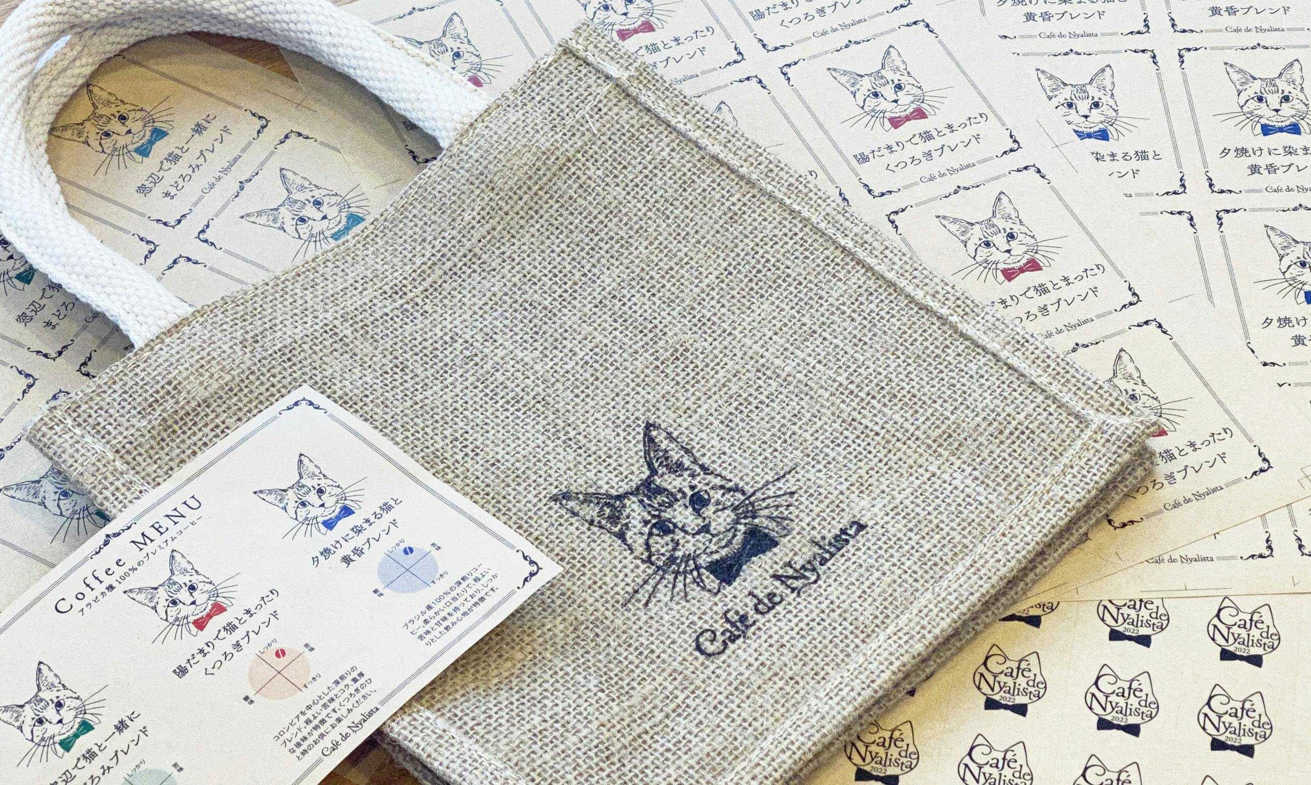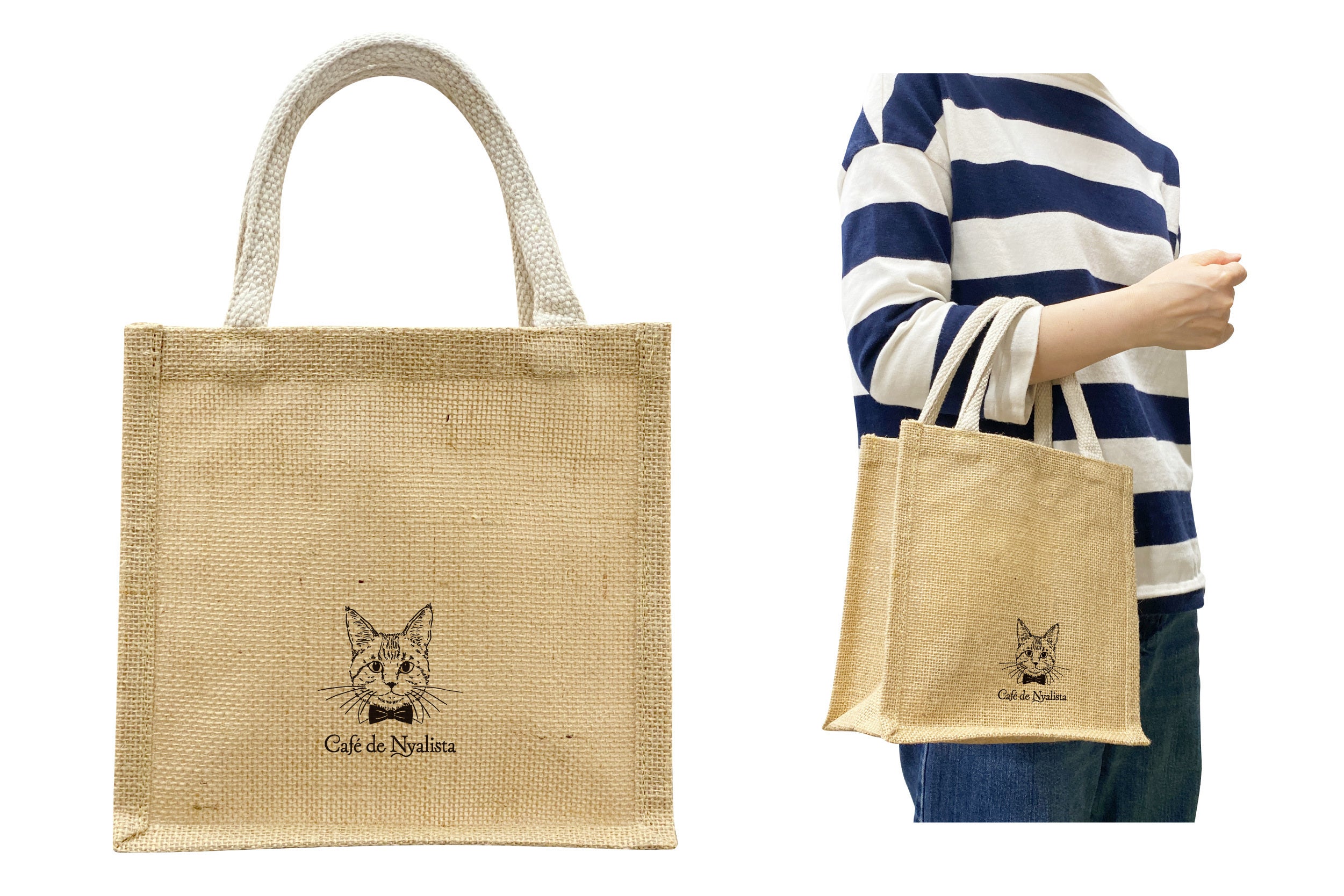 「ニャリスタの喫茶店」のロゴをプリントした、ナチュラルな雰囲気が魅力のジュート素材の小ぶりなトートバックです。