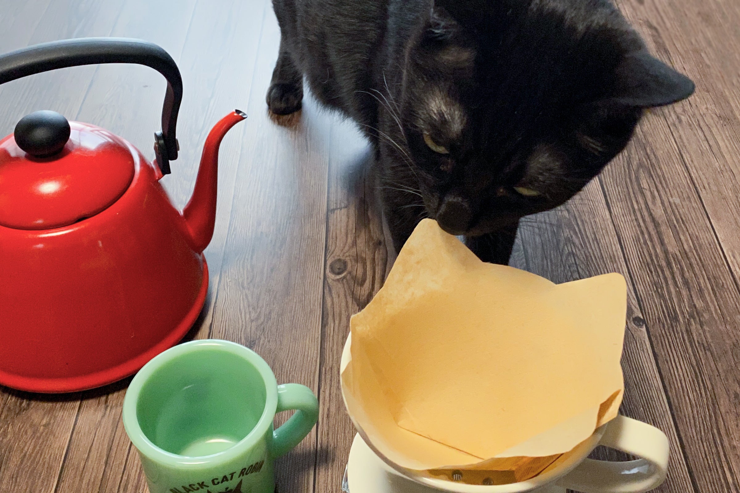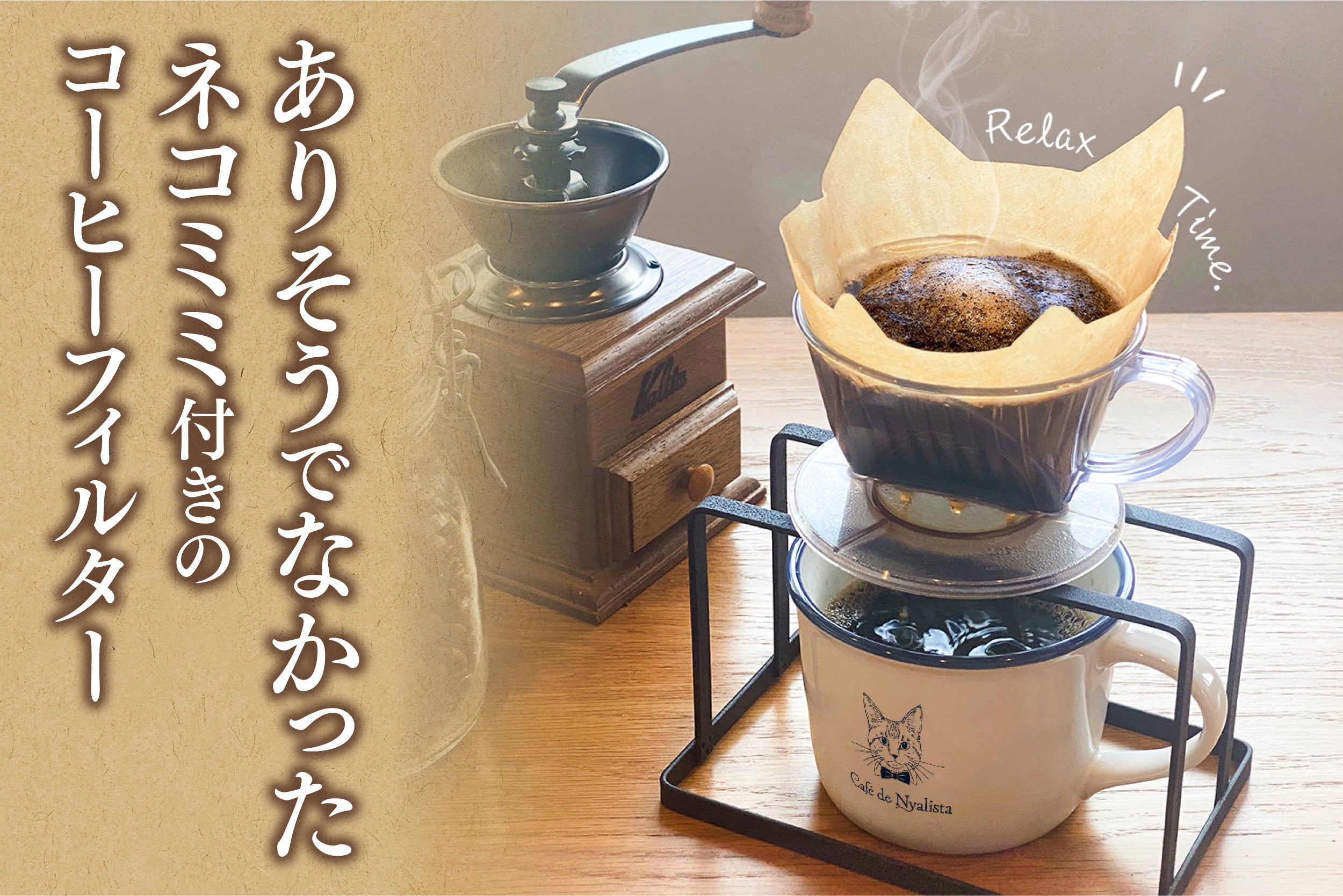 単純明快、コーヒーフィルターにネコミミがついただけという説明不要のかわいらしさと、ネコ好きならわかってもらえる倍増する癒し効果を、ぜひ体験していただきたいです。