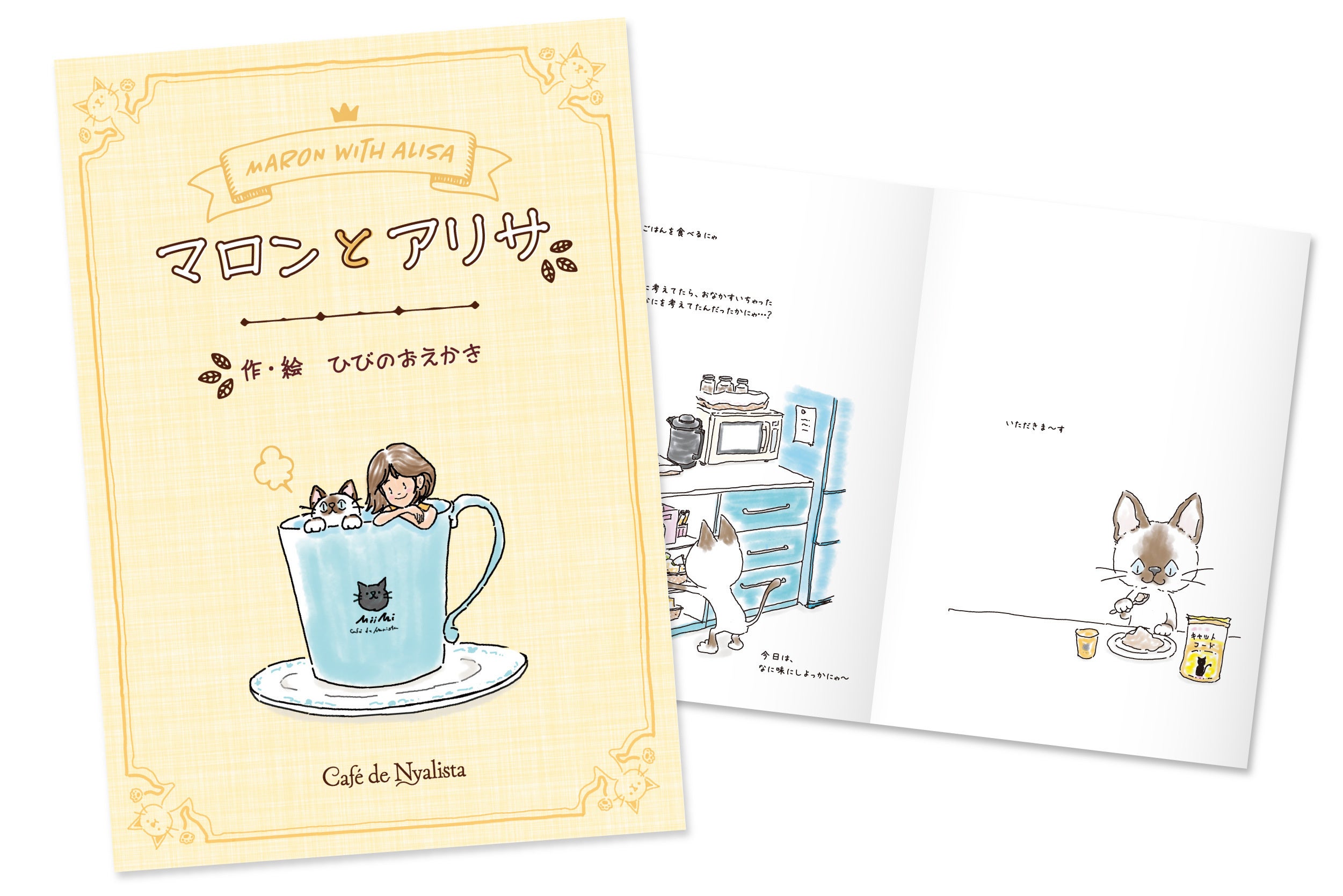 弊社は出版業もやっておりまして、絵本の出版実績も多数あります。その中から、ほっこり和む画風が人気で、ネコミミコーヒーフィルター“ミィミ”のパッケージその他のイラストも担当していただいた絵本作家さんにオリジナルミニ絵本(32頁)を作っていただきました。