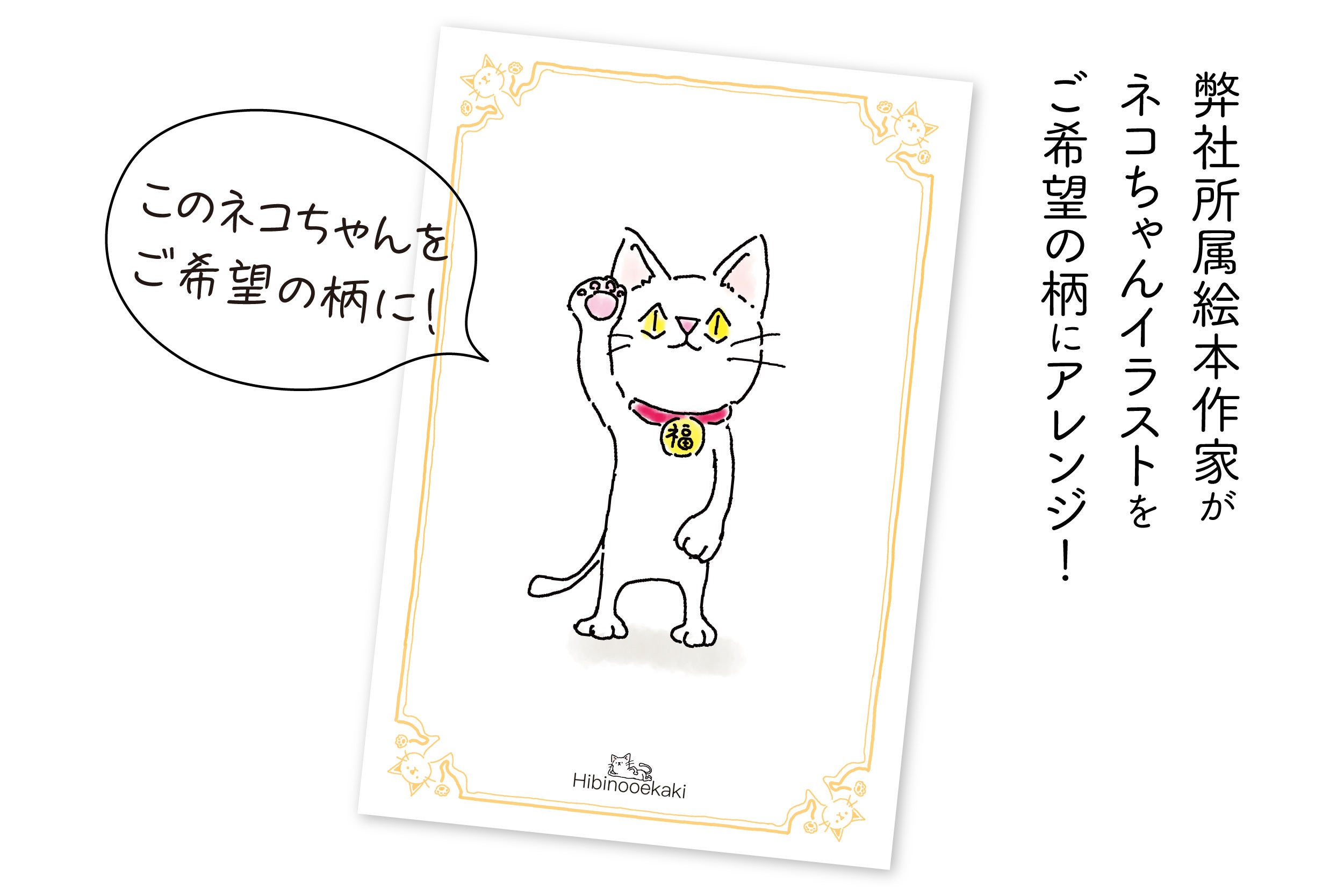 上記通常版ポストカードの他に、弊社所属絵本作家さんがあなたのリクエストにお応えして、ネコのイラストをお好みの柄にアレンジしてポストカードにします!