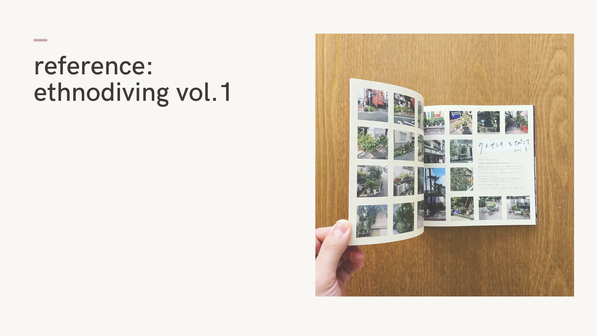 ちなみに、「vol.1」では9名のエスノダイバーたちが東京都大田区・梅屋敷という地域に飛び込み、古くから続くお祭り、道端に並べられた植木鉢、梅屋敷で生活する人々の会話など、様々な視点で地域を深堀りしてくれました。vol.1の制作でも、同じ地域に飛び込んでいるはずなのに見えている景色がひとりひとりぜんぜん違うということがとても新鮮でした。
