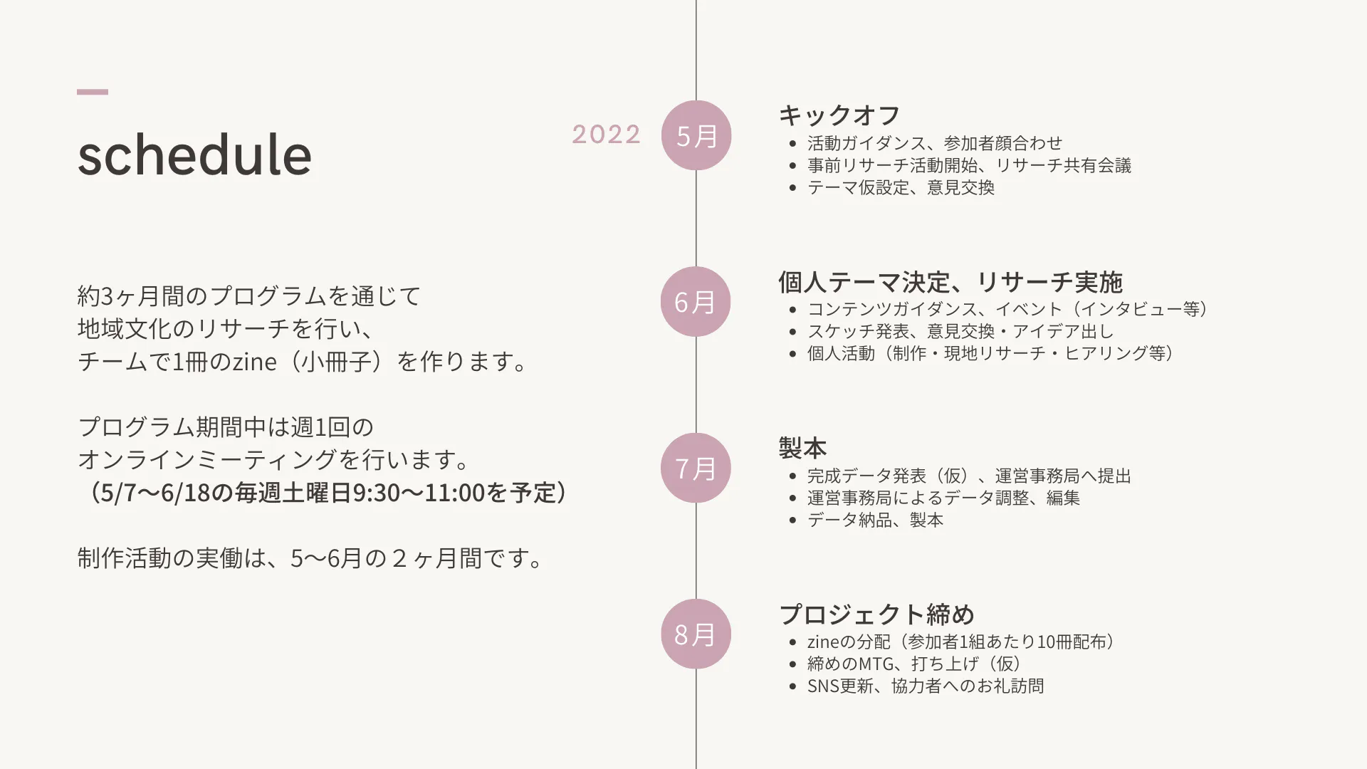 また、参加者でみんなでのまち歩き企画や週1回のオンライン編集会議を通して、運営チームと参加者のお互いの理解を深め合いながら、どんな1冊を作っていくかという議論をするのも醍醐味のひとつです。(プログラム期間中のまち歩き企画および編集会議は任意参加です。編集会議はアーカイブも残るので参加できない回があっても問題ありません。)