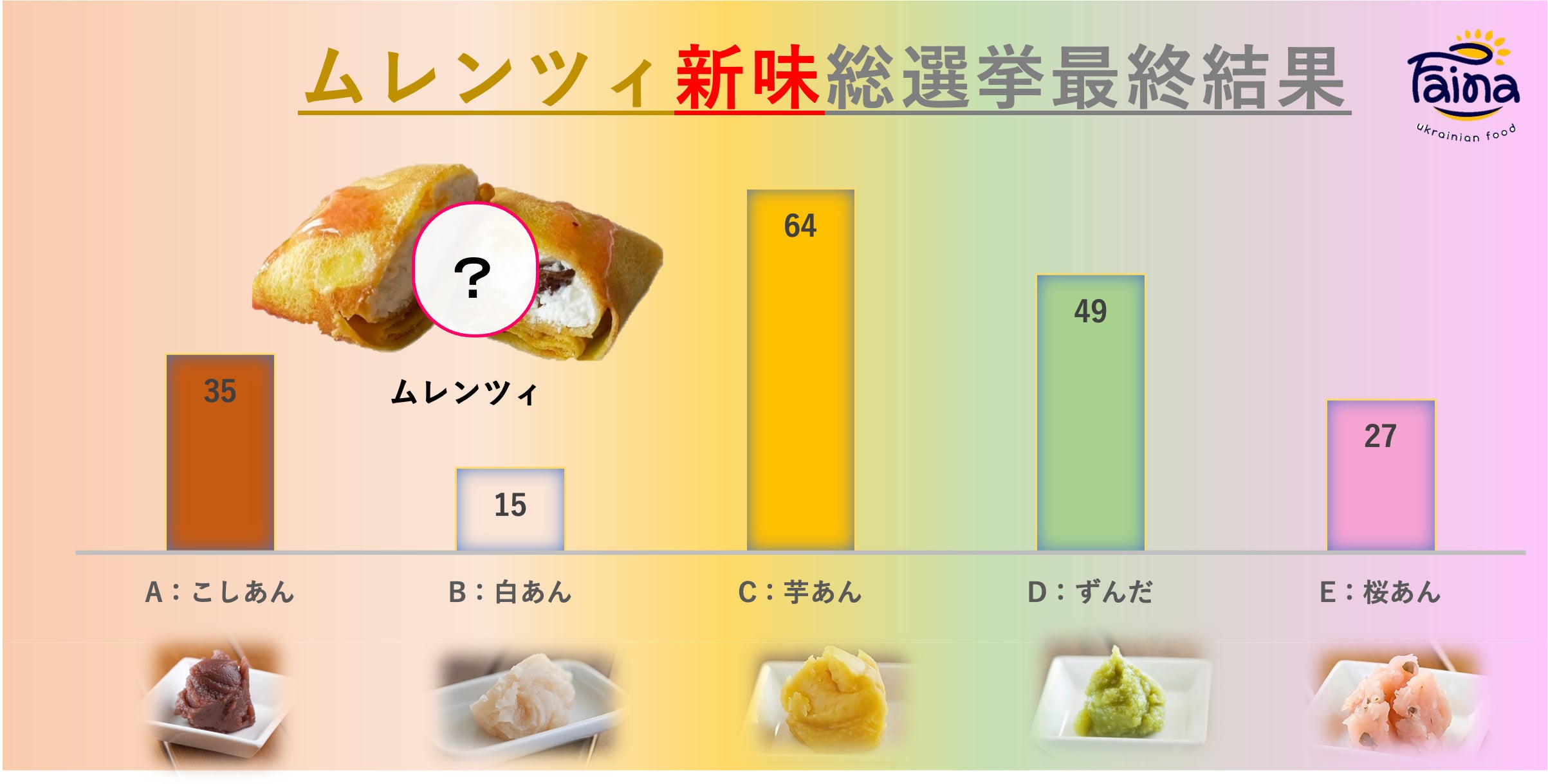 皆さまご連絡が遅れてしまい大変申し訳ございません!それでは結果発表です!ムレンツィ新味総選挙の結果、一位 芋あん二位 ずんだ三位 こしあん四位 桜あん五位 白あんとなりました!一位 芋あん二位 ずんだを The Faina の 新メニューに加えております!ご来店の際は、ぜひ、お一つ、召し上がってみてください!芋あんムレンツィずんだムレンツィご投票いただきました皆さま、ありがとうございました!