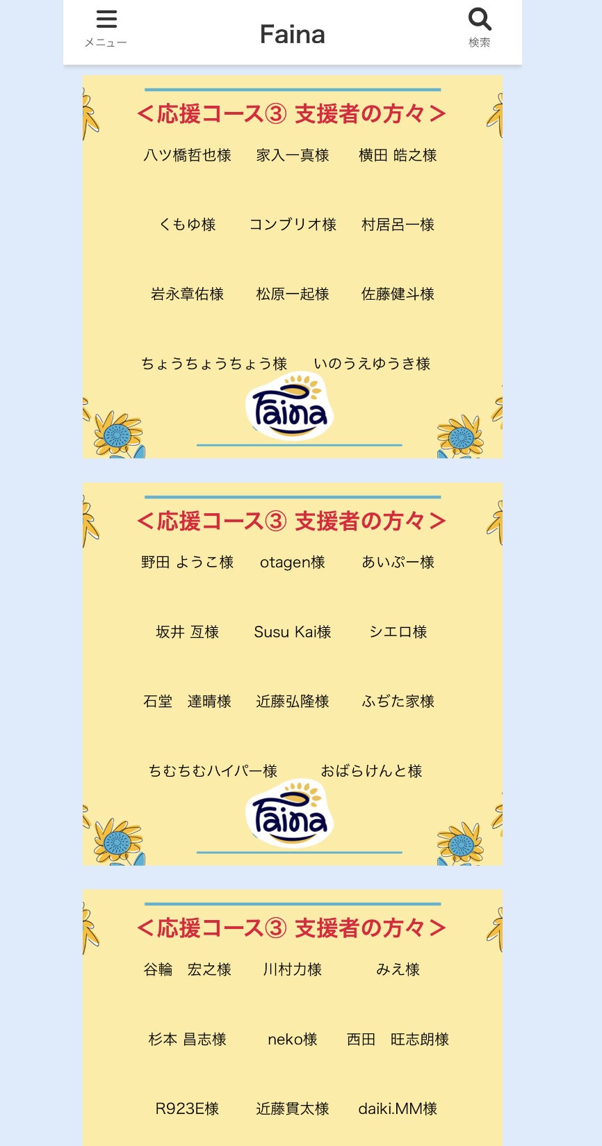 表題の通り、応援コース③にご支援くださった方々のお名前をファイナのホームページで掲載し始めました。
