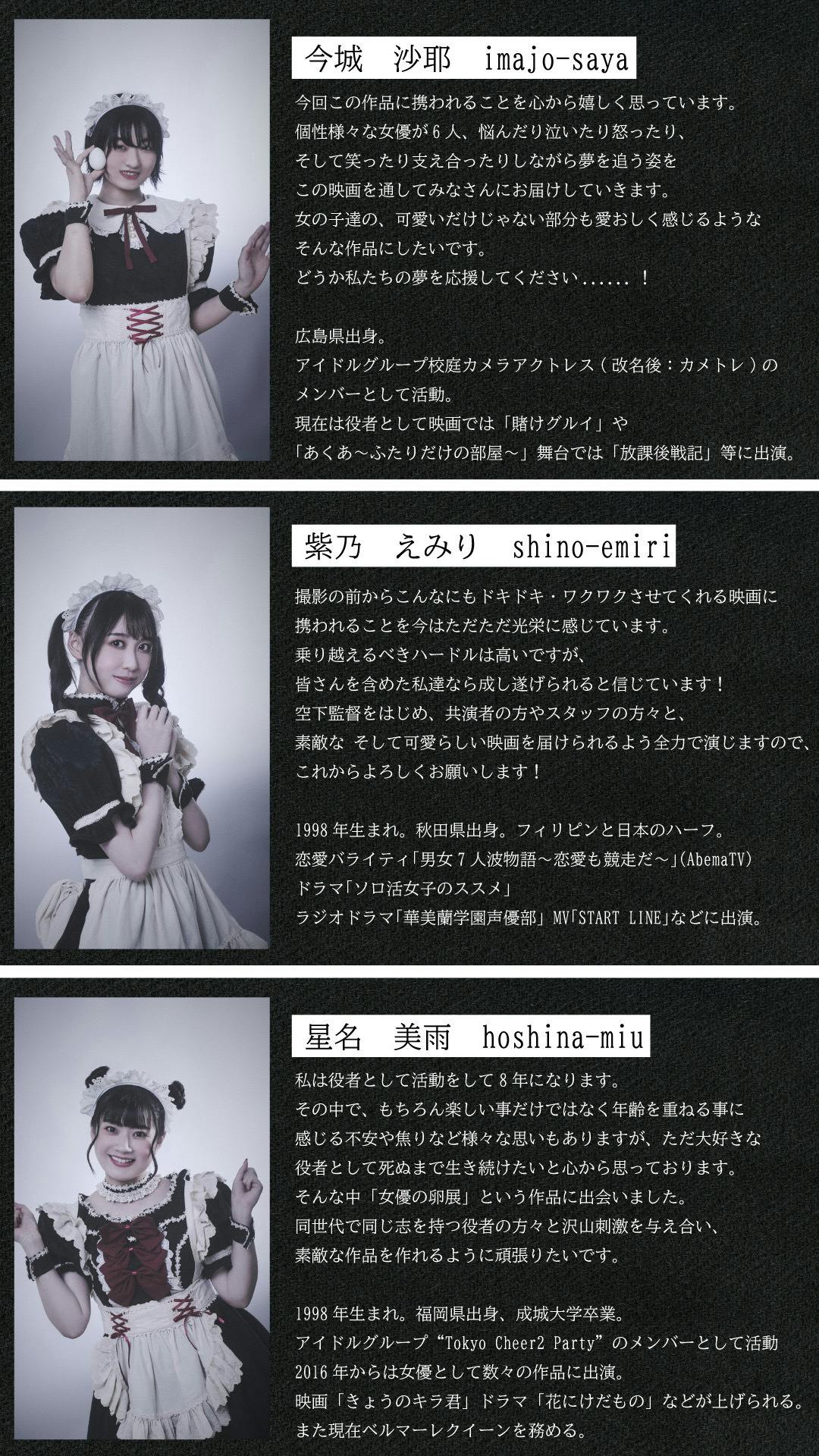 初めまして!当プロジェクトページをご覧頂き、誠に有難うございます。“女優にチャンスを!”をコンセプトに、未来ある女優の卵にスポットを当てその魅力を発信していくイベント【女優の卵展】です。