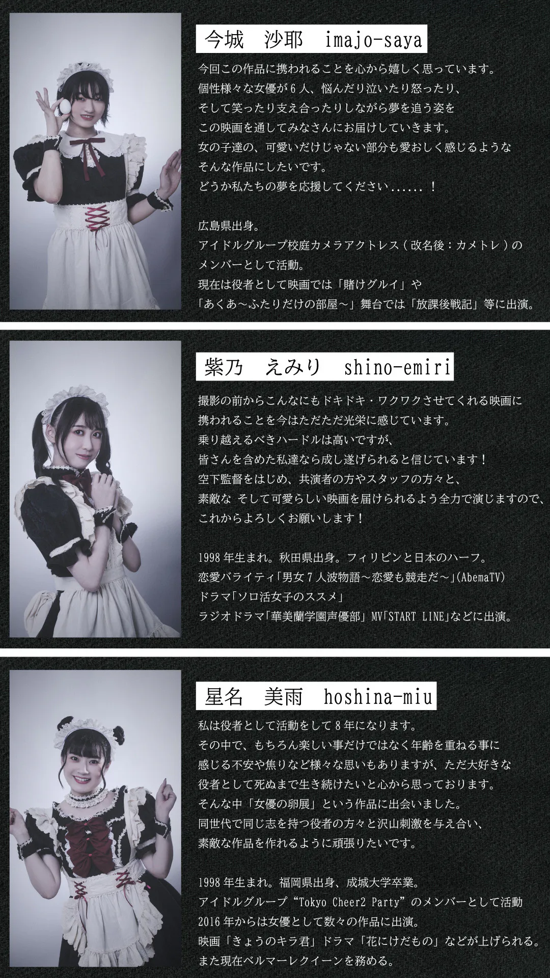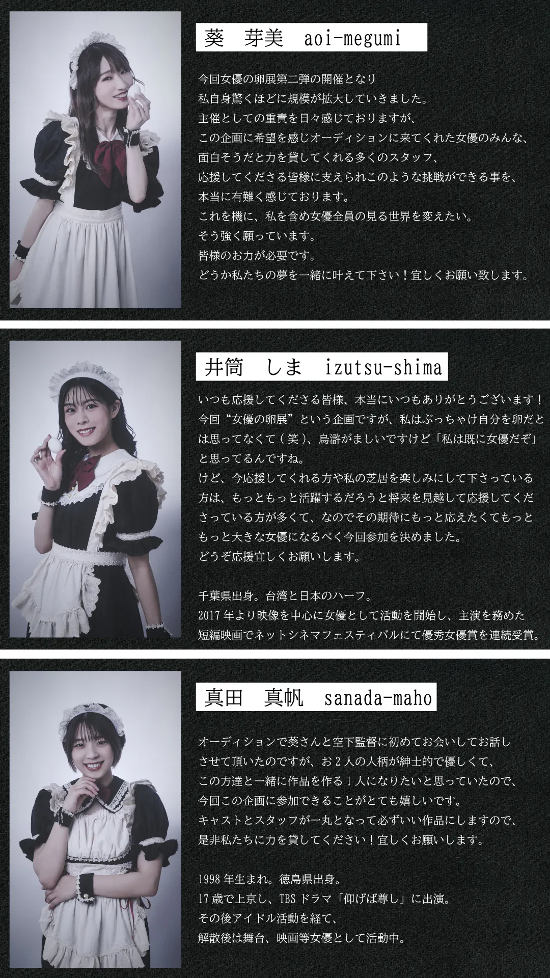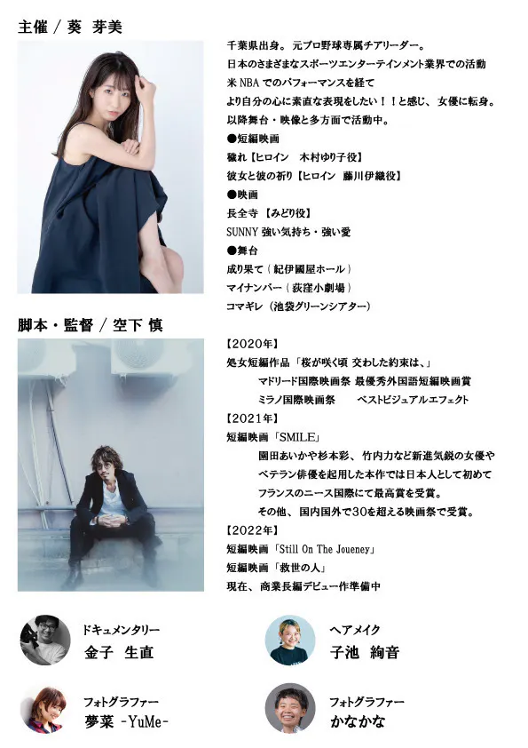 【女優の卵展】は、自身も女優として活動する 主催の葵 芽美が女優として生きる難しさに直面し、それでも尚 “女優でありたい” と考えた時に発案した企画です。