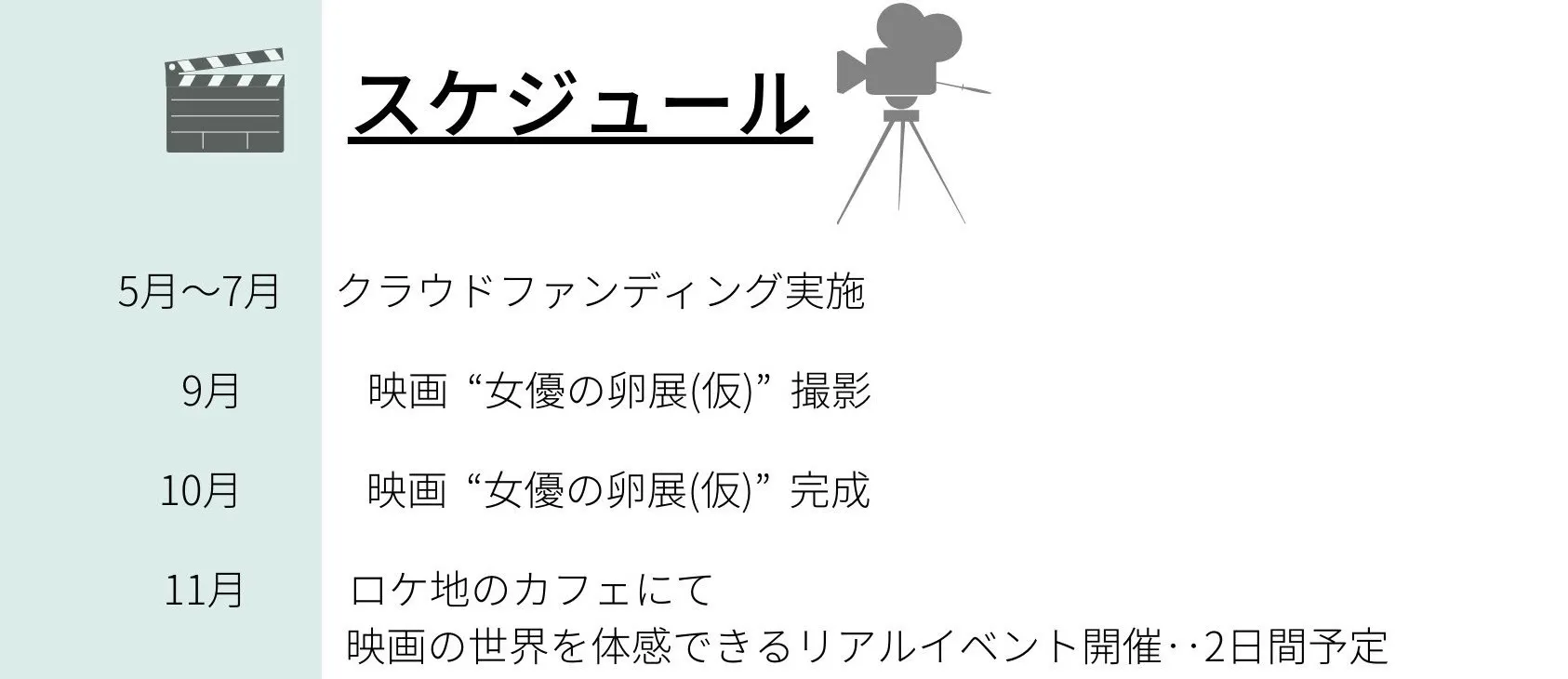 今回は企画の主軸となる映画制作、そして映画制作後のリアルイベント(上映会+写真展+映画体験型イベント)の実現に向けてのプロジェクトとなります。