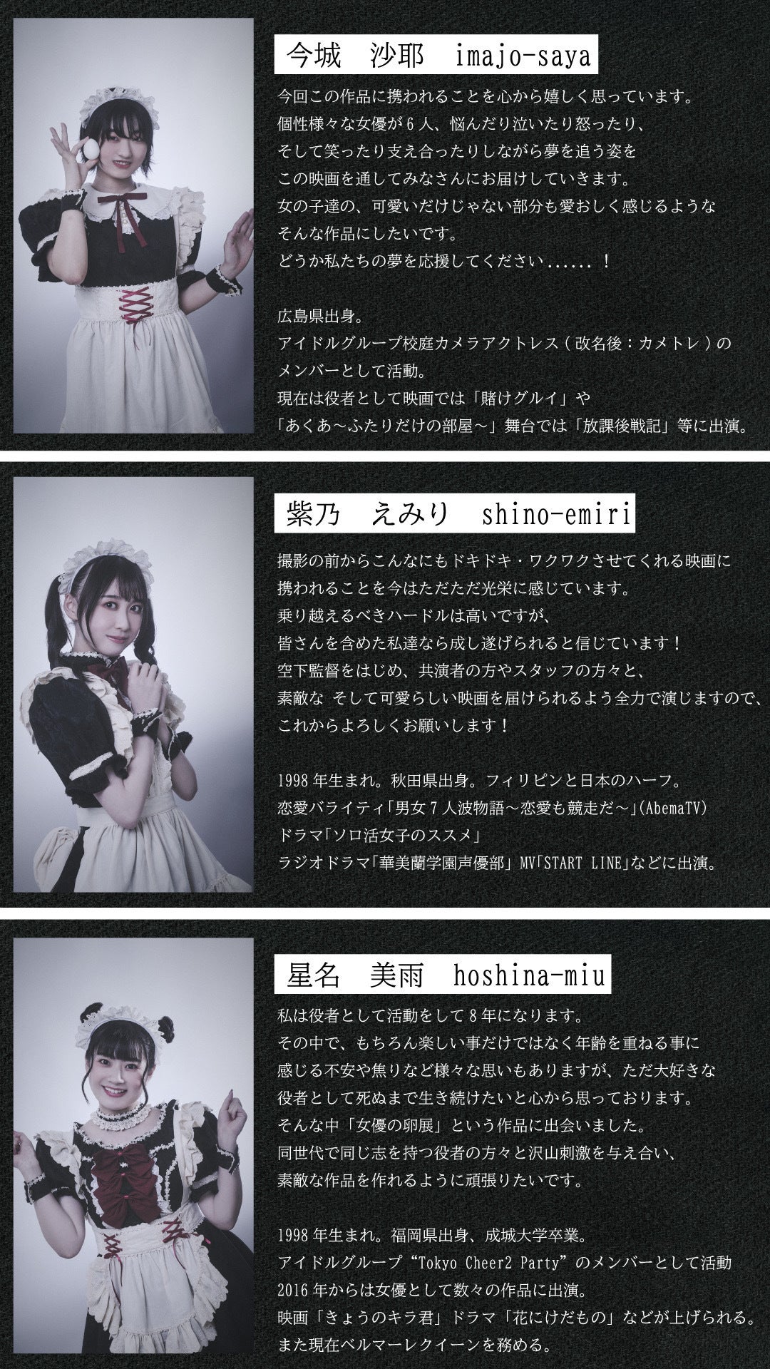 女優の卵たちが、女優であり続ける。そのために、各女優の名刺代わりとなるような映画を制作します!6名の女優全員にスポットを当て、各女優が最高に輝く映画を制作し、今後の女優活動を後押ししていきます。また、映画制作後、映画のロケ地である“カフェ”を会場に、映画の世界を味わえるイベントを開催予定です。映画の中の可愛い衣装を着た女優が、実際にカフェ店員としてお客様をおもてなし♪映画の中に登場するカフェメニューも味わえる、体験型リアルイベントです。一緒に制作した映画を鑑賞したり、女優の写真展を見たり‥“女優の卵たち”をとことん味わい尽くしましょう!!