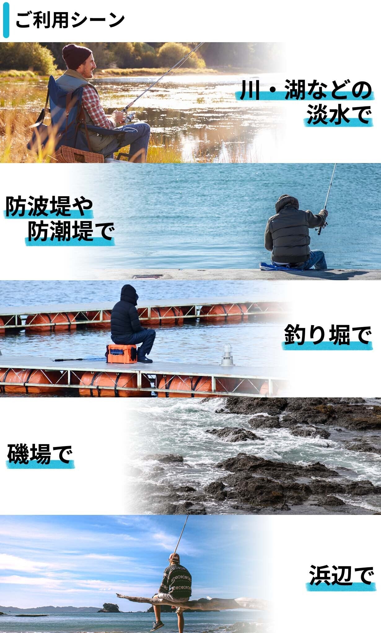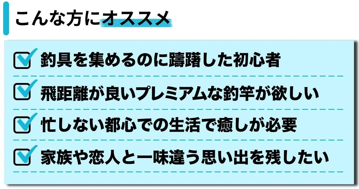 A:初めての釣りには多くの魚種を捕まえられる上に、比較的セッティングが簡単で場所を取らないのでオススメです。