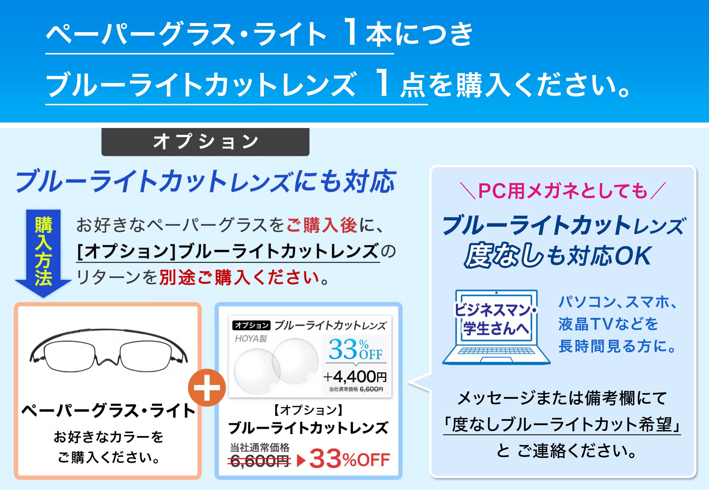 ご希望のペーパーグラスと “【オプション★33%OFF】ブルーライトカットレンズ” のリターンをご購入ください。