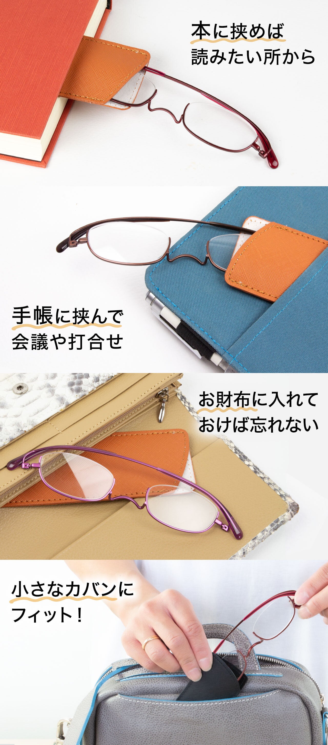 折り畳み時には本に挟む栞のように薄くなる老眼鏡です。