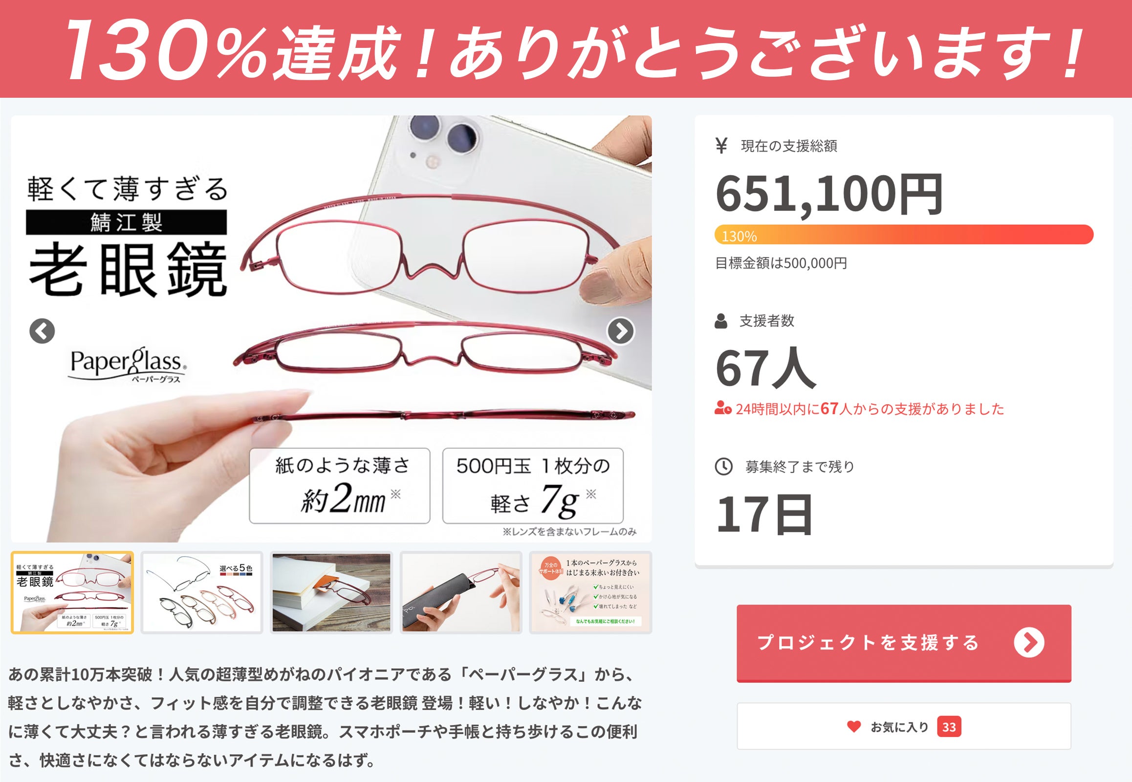 皆様こんにちは!プロジェクト開始12時間ほどで早くも目標金額を達成しました。初めてのCAMPFIRE、支援者ゼロだったらどうしよう...なんて心配していましたがご支援いただいた皆様、本当にありがとうございます!嬉しいコメントもいただき、ありがとうございます。もっと多くの方にペーパーグラスをお使いいただく快適さや感動をお届けしたい!と感じています。今後の活動レポートではカラーの詳細や便利な使い方など、商品について詳しく紹介していく予定です。プロジェクト終了まであと17日!最後までどうぞよろしくお願いいたします。▼プロジェクトページはこちらhttps://camp-fire.jp/projects/view/578901---------------▼ペーパーグラス 公式ホームページhttps://www.paperglass.jp/▼直営店もございます。※直営店ではCAMPFIRE特別価格での販売は行なっておりません。https://www.paperglass.jp/info/dealers/
