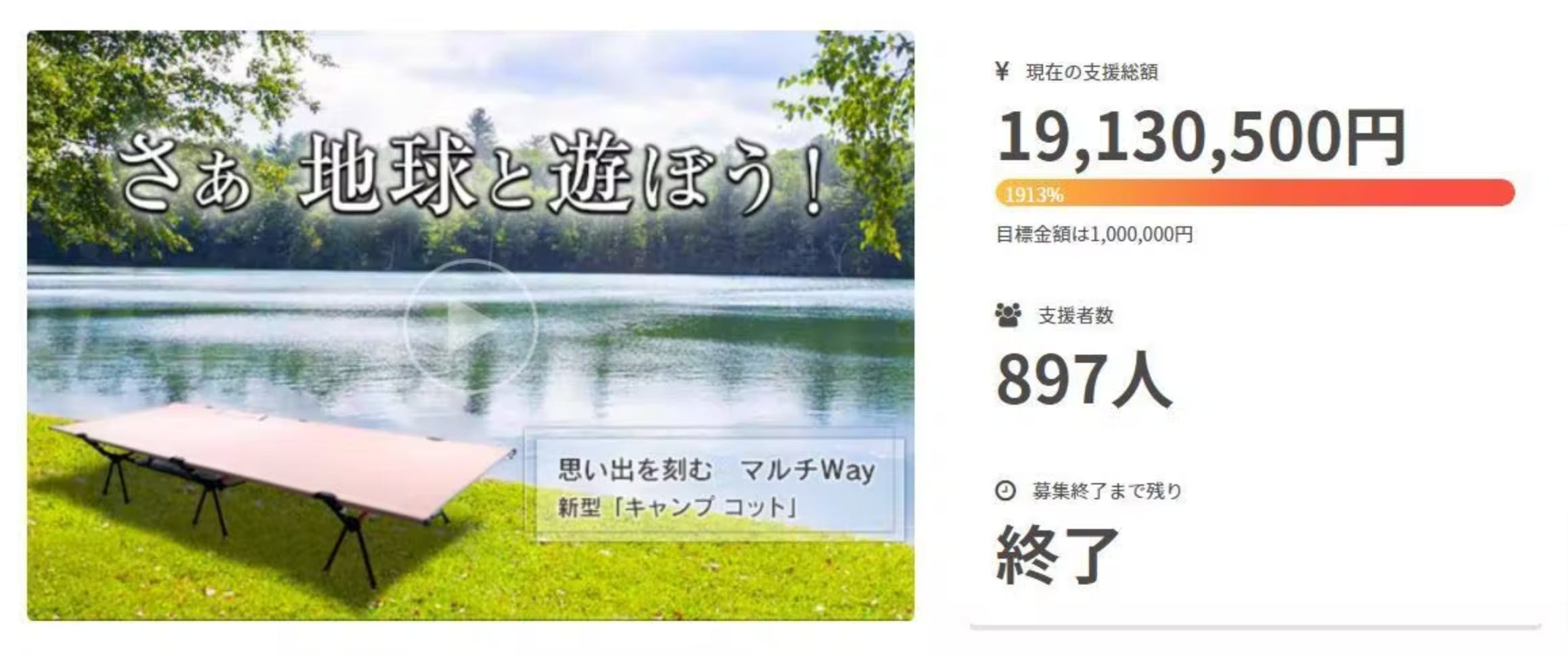 2021年3月、誕生と共にクラウドファンディング総支援2,000万円超えしたキャンプコット「 Naturaldrop 」