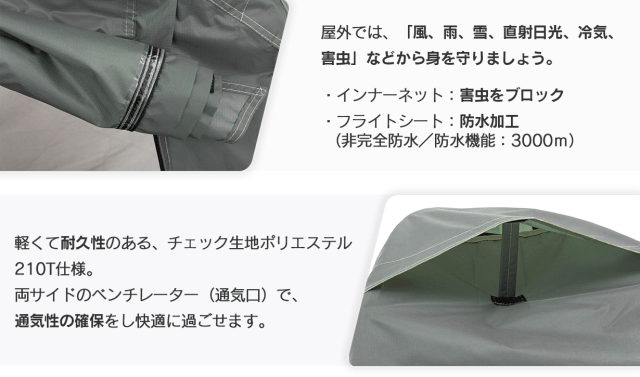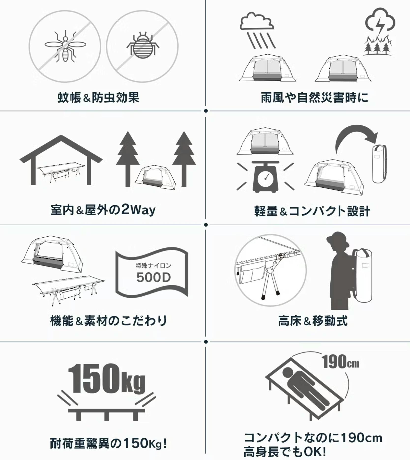 テント、コット共に単独利用は勿論のこと、テントコットの一体型で移動可能、屋内、屋外と、利用用途は幅広くご利用できます。
