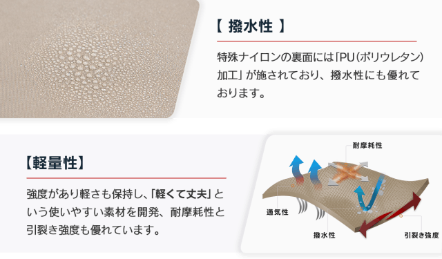 強度に優れた糸を使った特殊ナイロン。もちろん摩擦や引き裂き、擦り切れにとても強くアウトドアの過酷な環境下などにもピッタリの素材を採用。