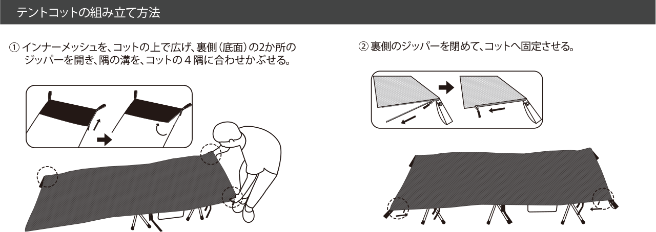 コットとインナーネットの装着方法は、下記のようにインナーネット裏のジッパーを開き、コットの4隅に被せ、ジッパーを閉じて頂き設置完了です。