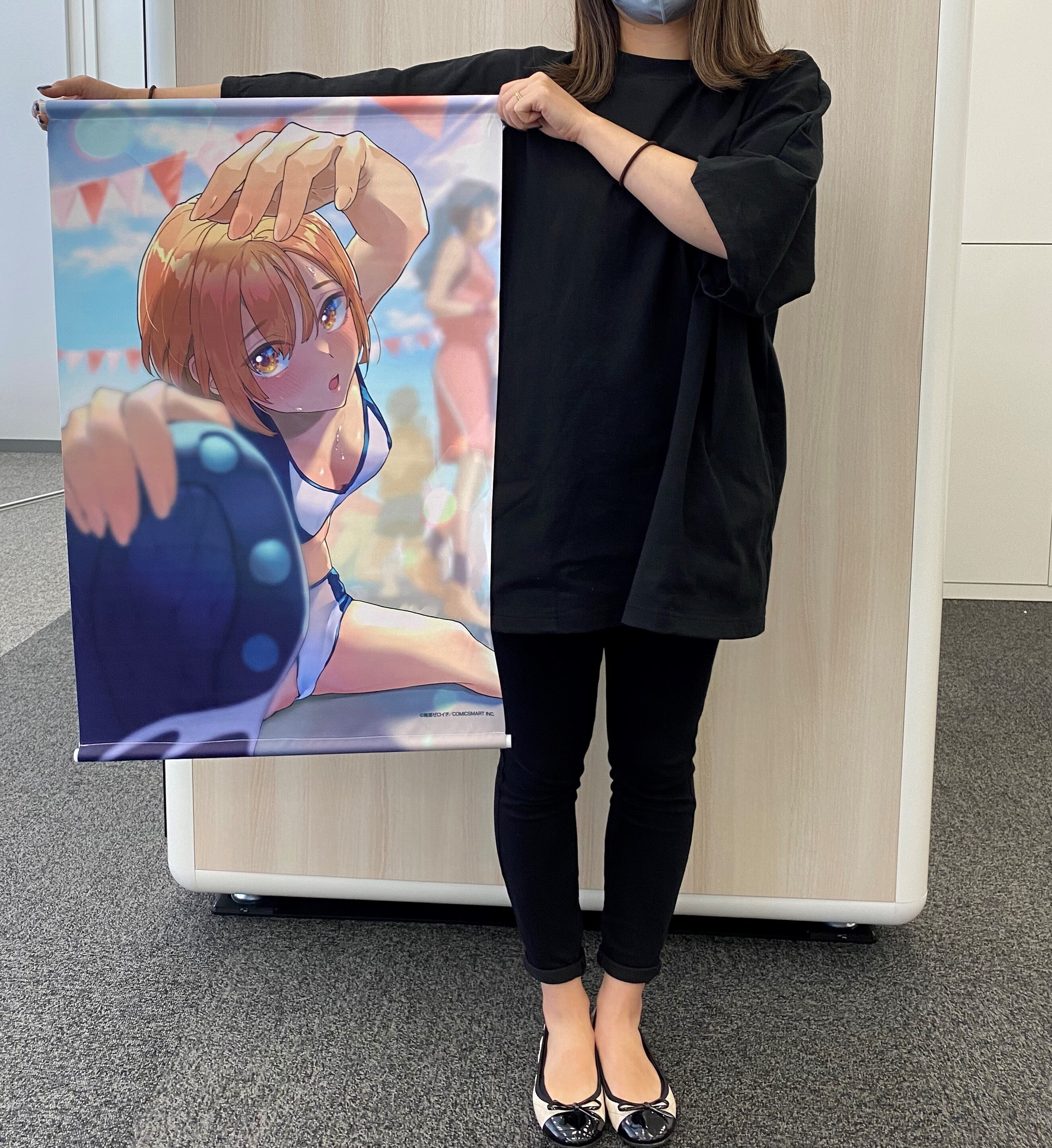 サイズとしてはB2サイズで、身長156cmのスタッフが持つとこんな感じです↓
