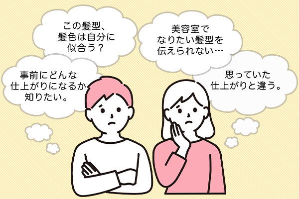 美容室・オンラインでのカウンセリングや、スタイリストとの仕上がりイメージの共有など、ヘアスタイルデザイナーのシミュレーション画面をお見せ頂くことで 、より具体的に“ なりたい髪型 ”に近づきやすくなります。