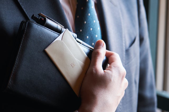 もし急な商談に呼ばれても、ジャケットは名刺付き。スーツ、ジャケット、コートのポケットに複数箇所に仕込むと余裕が生まれます。