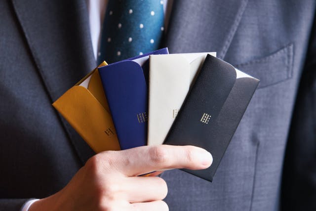 打ち合わせで、手帳やメモ帳には入れておきたい必須アイテムになります。「手帳・メモ帳を持っていること=名刺を持っている」という名刺入れを用意する必要はありません。