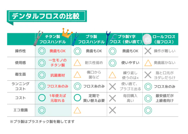 A:上記記事と重なりますが、チタン製フロスは一人年間1,460円程度に対して、プラスティック製フロスは一人年間5,475円程度で、1人当たり年間4,015円程度、約6割ものコスト削減効果があります。