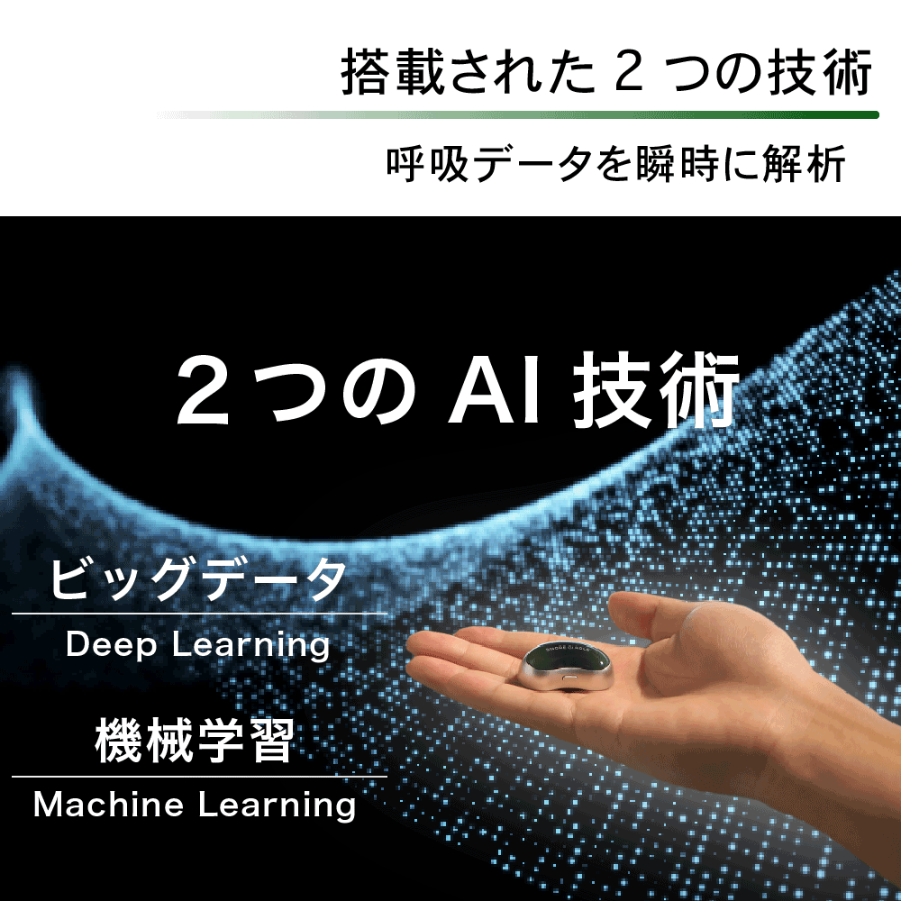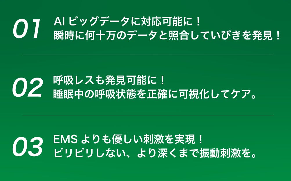 Snore Circle PROは、ビッグデータ解析の機能追加によって「いびき」だけではなく「呼吸レス」状態も見つけることが可能になりました。いびき同様に発見すると、微弱な振動刺激を発信し、ケアを行います。