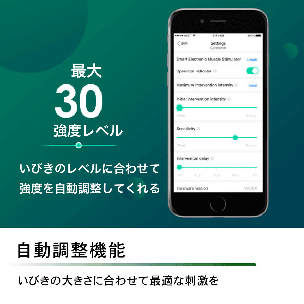 スマートフォンアプリによる細かい設定などを行わなくても、本体が自動的にご利用者のいびきレベルに合わせて刺激を調整します。