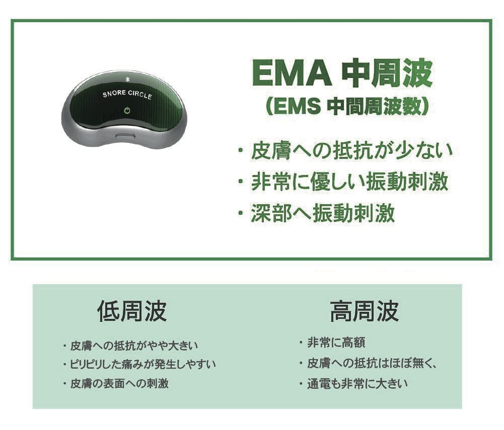 検知すると、本体から眠りを妨げない微弱なEMA中周波を発信することで発生したいびきをケアします。