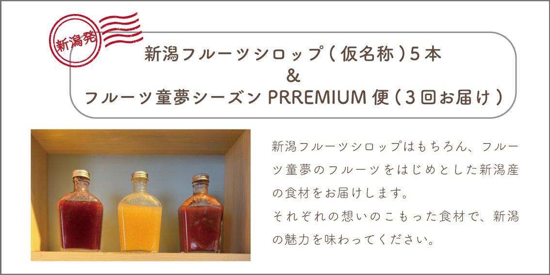 ※返礼品としてお届けする新潟フルーツシロップはサンプル段階のものになります。もちろん味や品質は保証いたしますが、原材料や表記については変更となる場合があるため、現時点では明記しておりません。