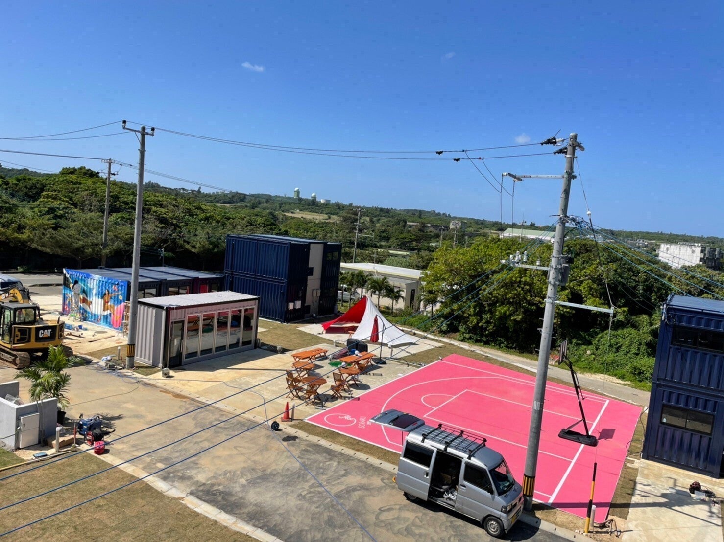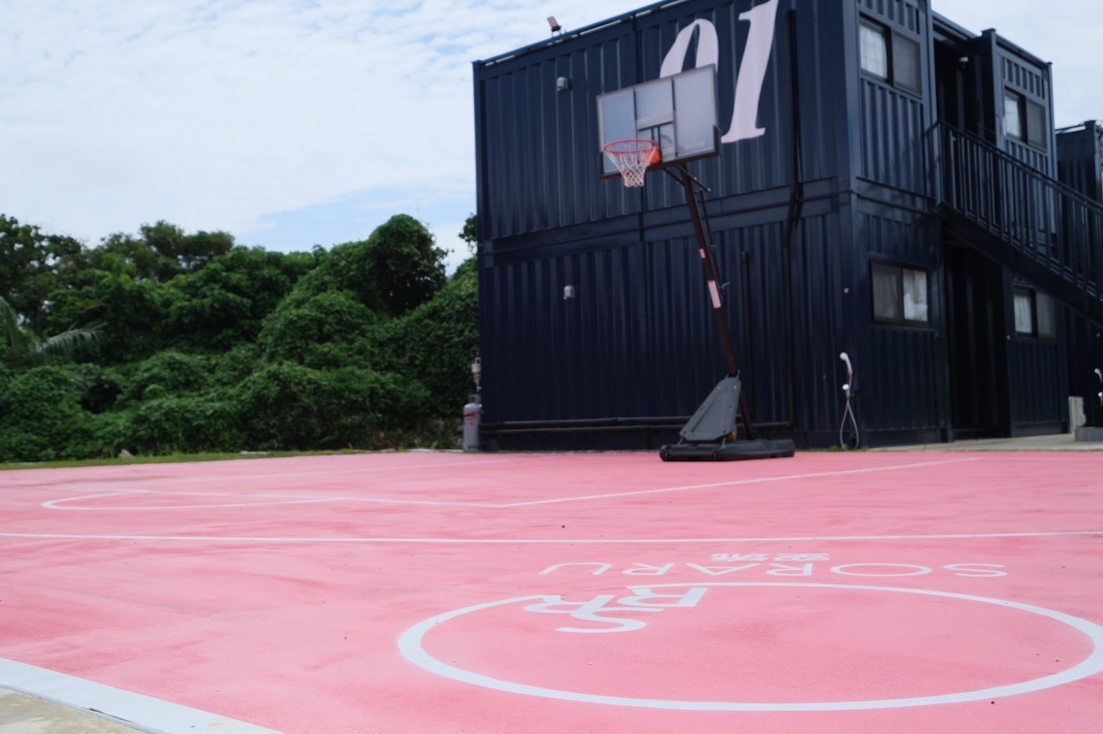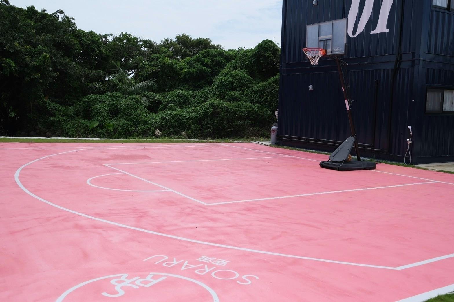 ピンクのバスケットコート、その正面にはバースペースやタープなどがあります!