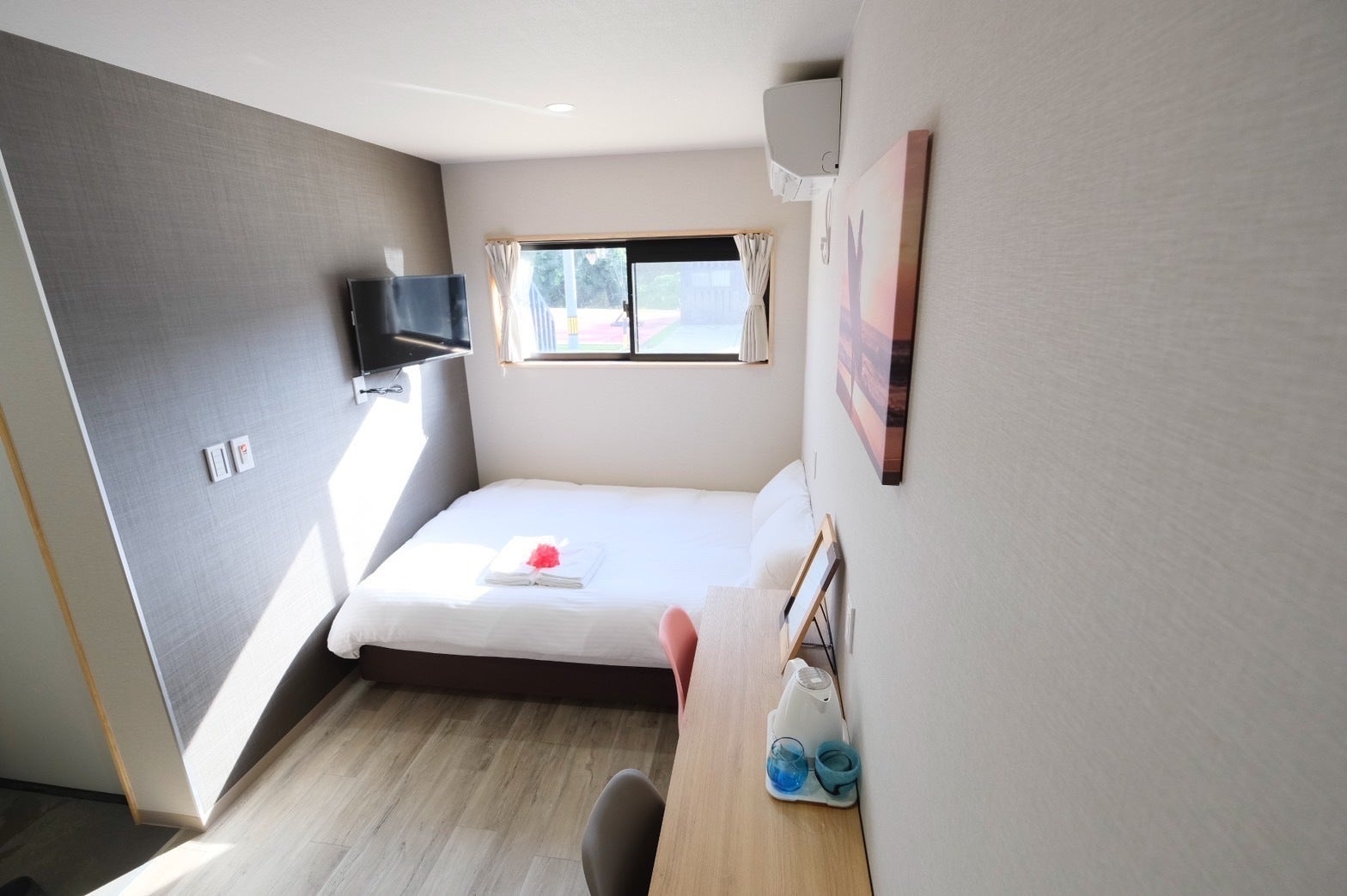 外から見ると、大人の秘密基地のようなカッコいい雰囲気ですが、室内は通常のホテルのお部屋のような清潔感と利便性を兼ねそろえていますので、ゆったりとくつろいでいただけます。