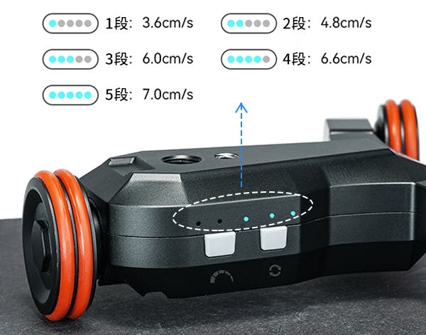 5段階のスピード調整を撮影ニーズに応じて行うことが可能です。3.6cm/sの最低速度でも従来の製品より速く、より効率的に撮影を進行することができます。また、本体にはLEDライトの速度表示ライトが付いており、進行中もスピードを分かりやすく確認できます。