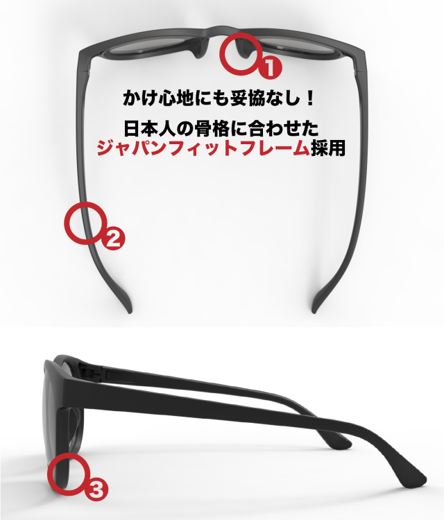 「Sorge×Re:」のコラボサングラスは、日本人の骨格に合わせて、フレームカーブやノーズパッドが作られたジャパンフィットフレームを採用しています。
