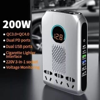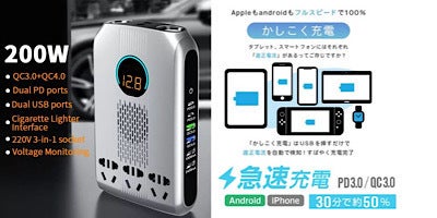 ・車からの電流を100V家庭用電流に!最大200WのAC出力パワーと100WのDC出力パワーで、複数の端末へ同時に充電可能!