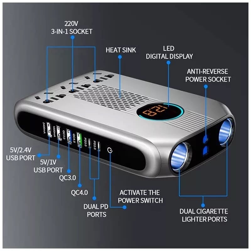 - 給電口11口:USB給電口×6(USB出力電流:PD3.0×2 QC4.0 QC3.0 2.4A 1.0AUSB出力電圧:5V)、3口ACコンセント×3 シガーライターソケット×2