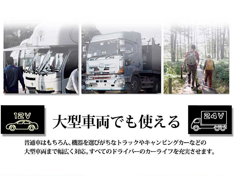 12V/24V両方対応できるシガーソケットを搭載しており、車種を選ばず使えます。