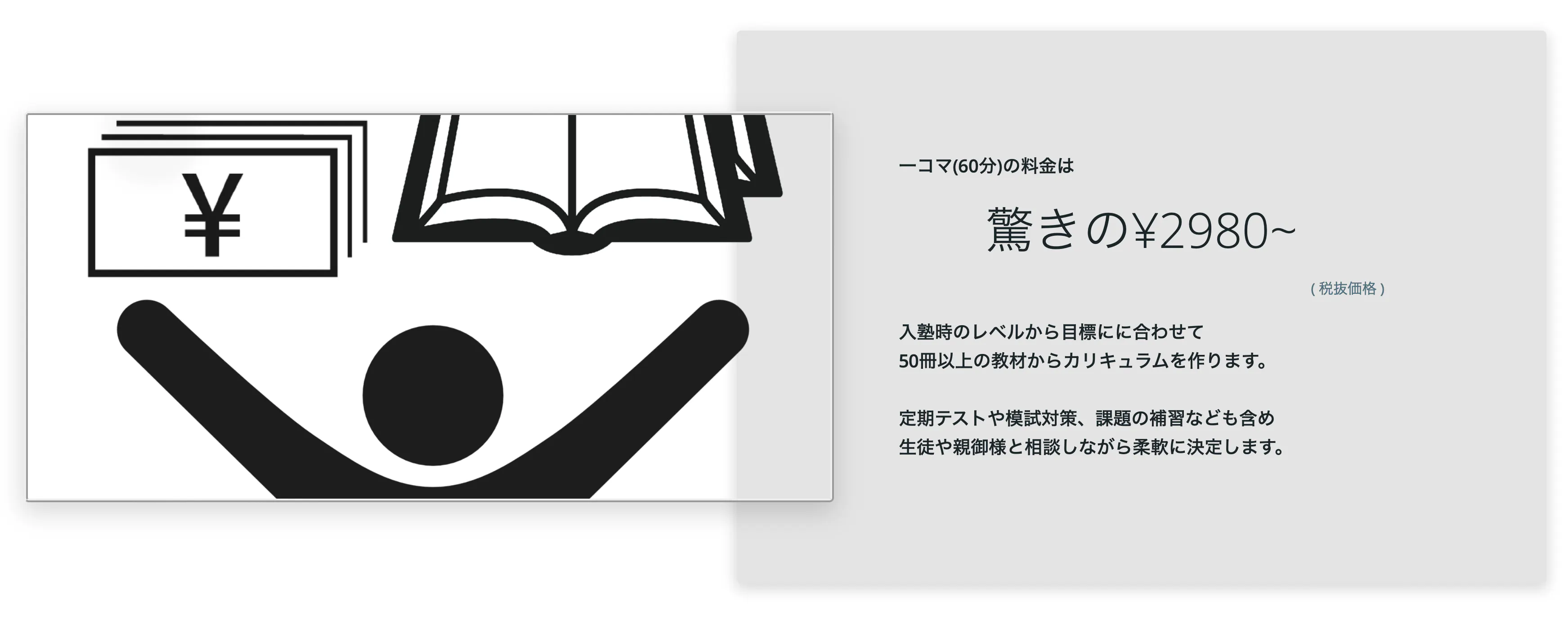 ・料金につきましては、週一回受講/中一の場合1コマ(60分)あたり¥2980円(税抜)とさせていただきます。週2回以上や講習期間中はさらにお値下げを致します。学習習慣をつけさせたいといった理由で塾をお探しの方も気軽に入塾できる料金でご提供させていただきたく存じます。