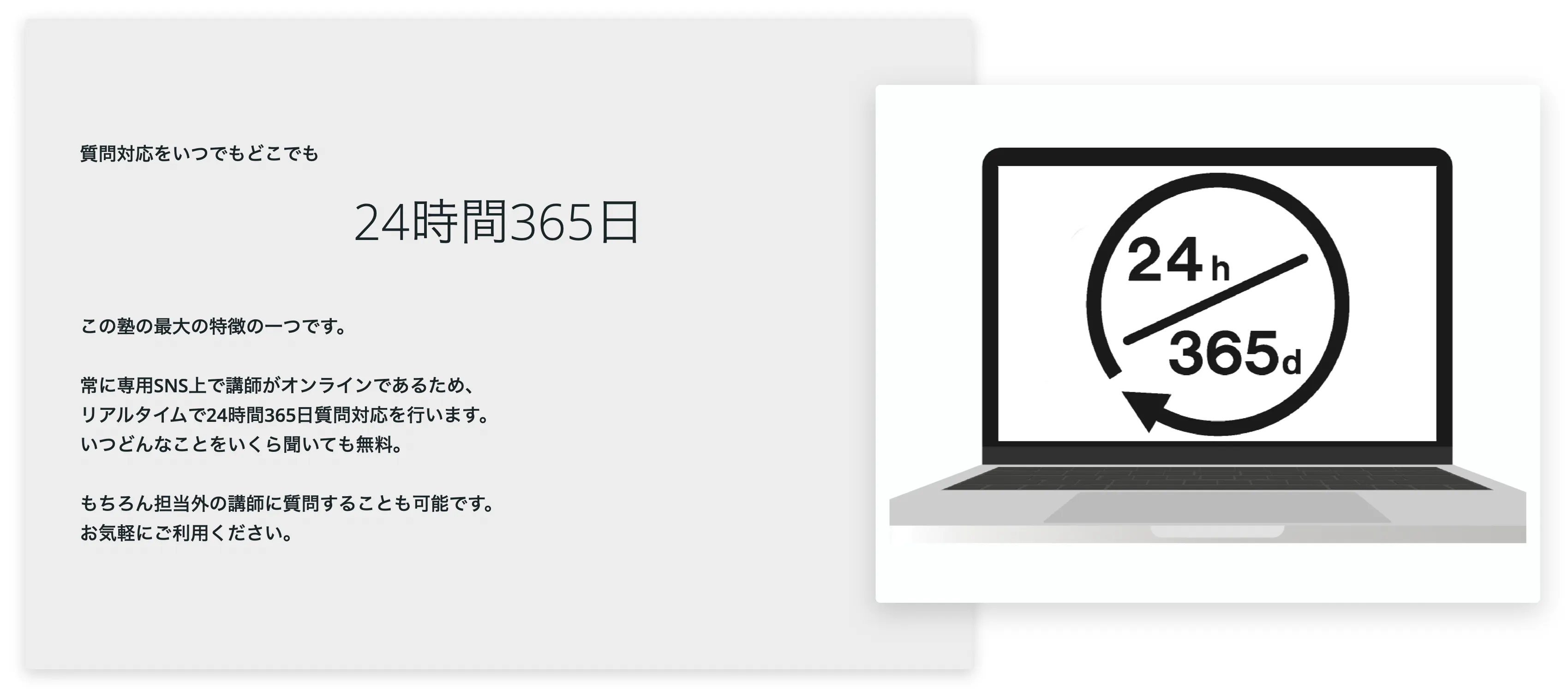 ・24時間質問対応につきましては、生徒と講師が直接繋がる専用のLineのようなSNSを活用します。どんな質問対応や進路の相談なども気軽に、時間を気にせず可能な環境を作ります。