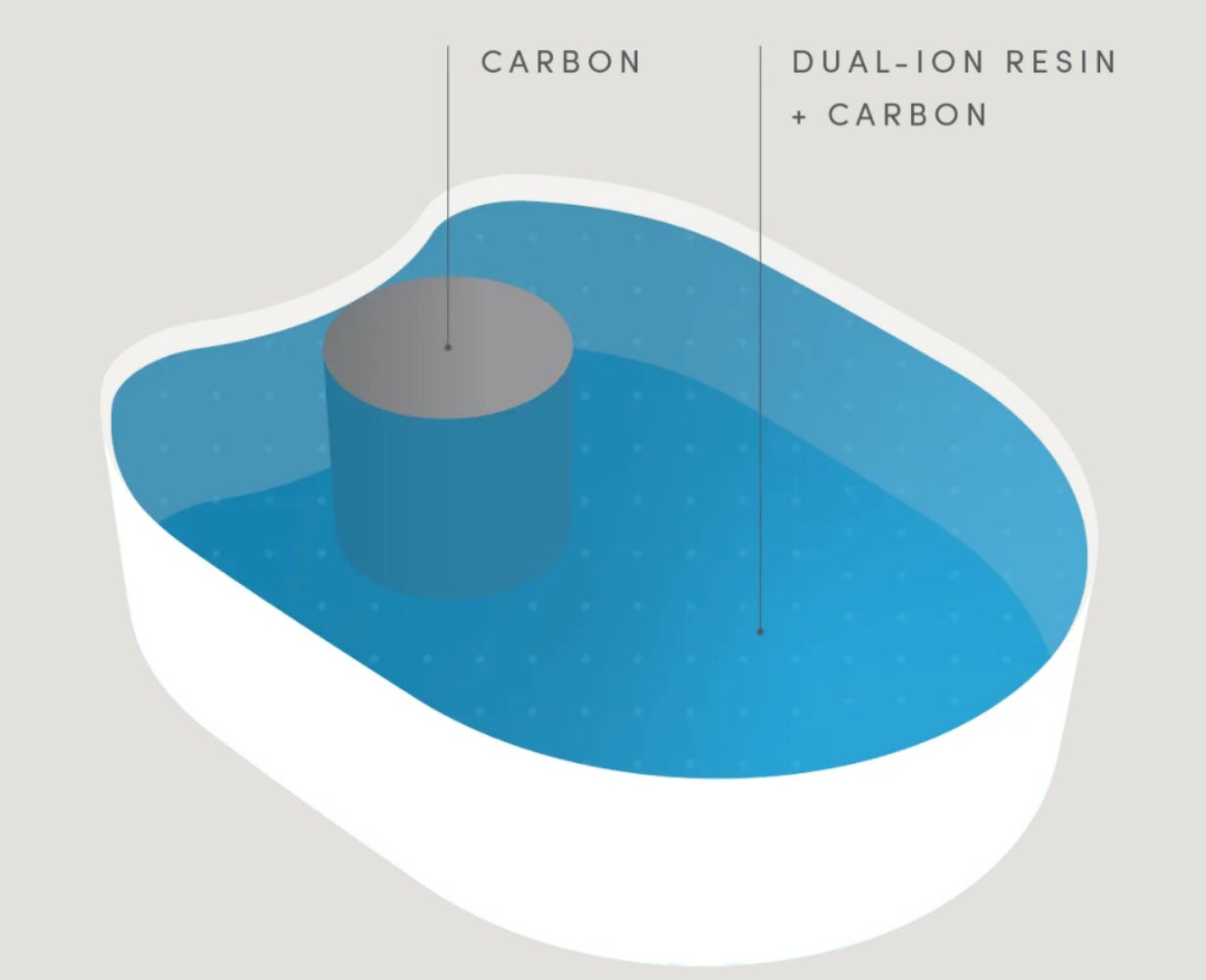 PeakWaterのフィルターはイオン樹脂と活性炭の2層構造になっています。