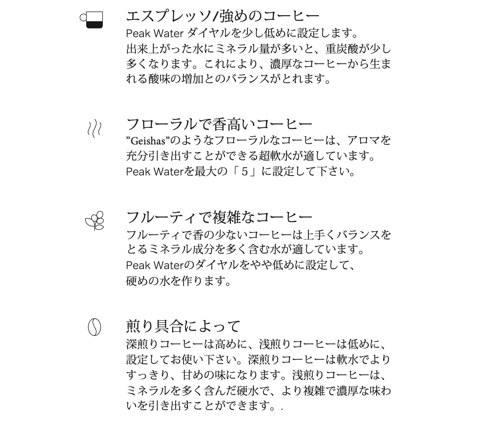ほとんどのボトルウォーターに含まれる溶存固形分は飲用には適していますがコーヒーには最適ではありません。また環境にも優しくありません。PeakWaterは環境にも配慮し、ワンランク上のコーヒーを淹れることができます。