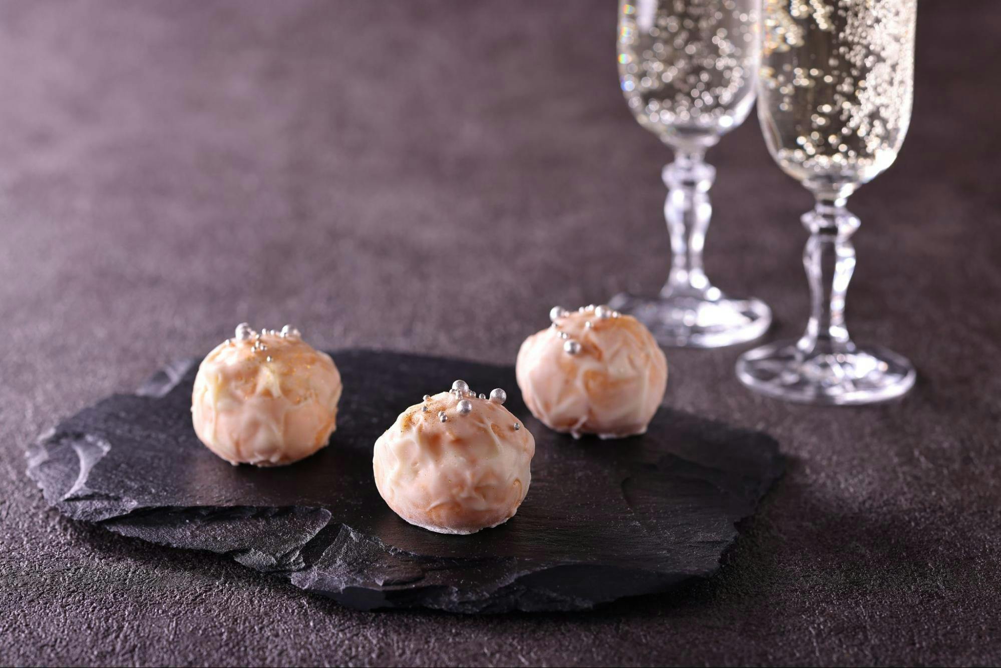 美山産のきぬひかり米をシュー生地に練り込み、オレンジリキュールが薫るガナッシュを包みました。また、真珠パウダーと金粉が演出するラクシュリーな外観にも、ギリギリまでこだわりました。