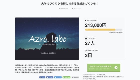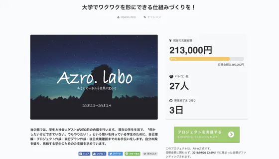 私たちAzroはAzro.labo合宿の開催に向けて、クラウドファンディングでの支援をお願いしております。2018年2月24日16時現在で21万3000円ものご支援をいただきました。目標金額の26万円のうち81%を達成いたしました。皆さまのご支援、本当にありがとうございます。