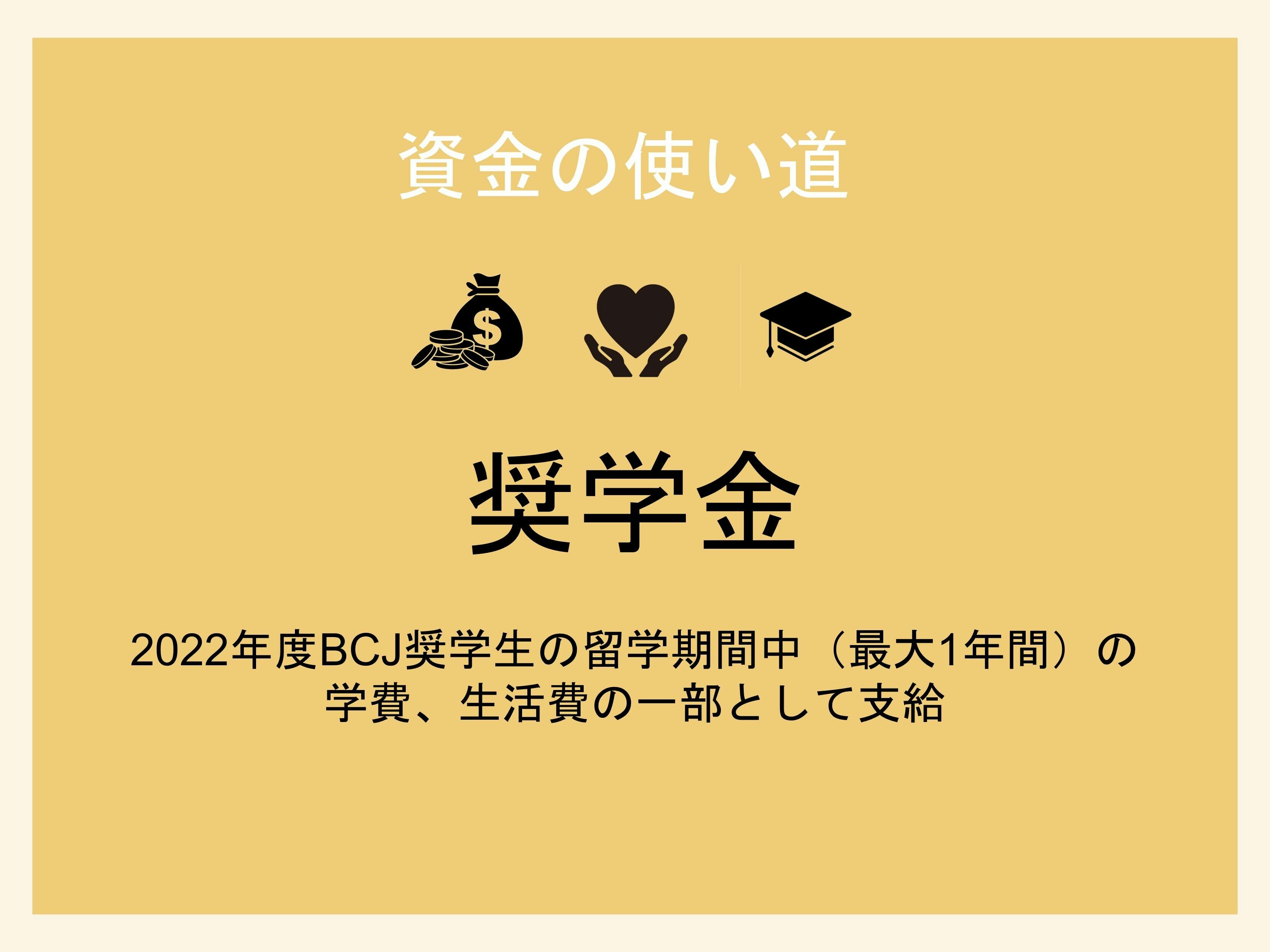 過去10年で総勢13名の未来を担う若者に対して、1年間の学費・生活費の一部を貸与ではなく、給付という形で支援してきました。 活動開始から10年という節目で「さらにより多くの若者の夢を後押ししたい」という想いを形にするため、2021年は名称を「BCJ奨学金」と変更し、将来を見据えて財団を設立いたしました。