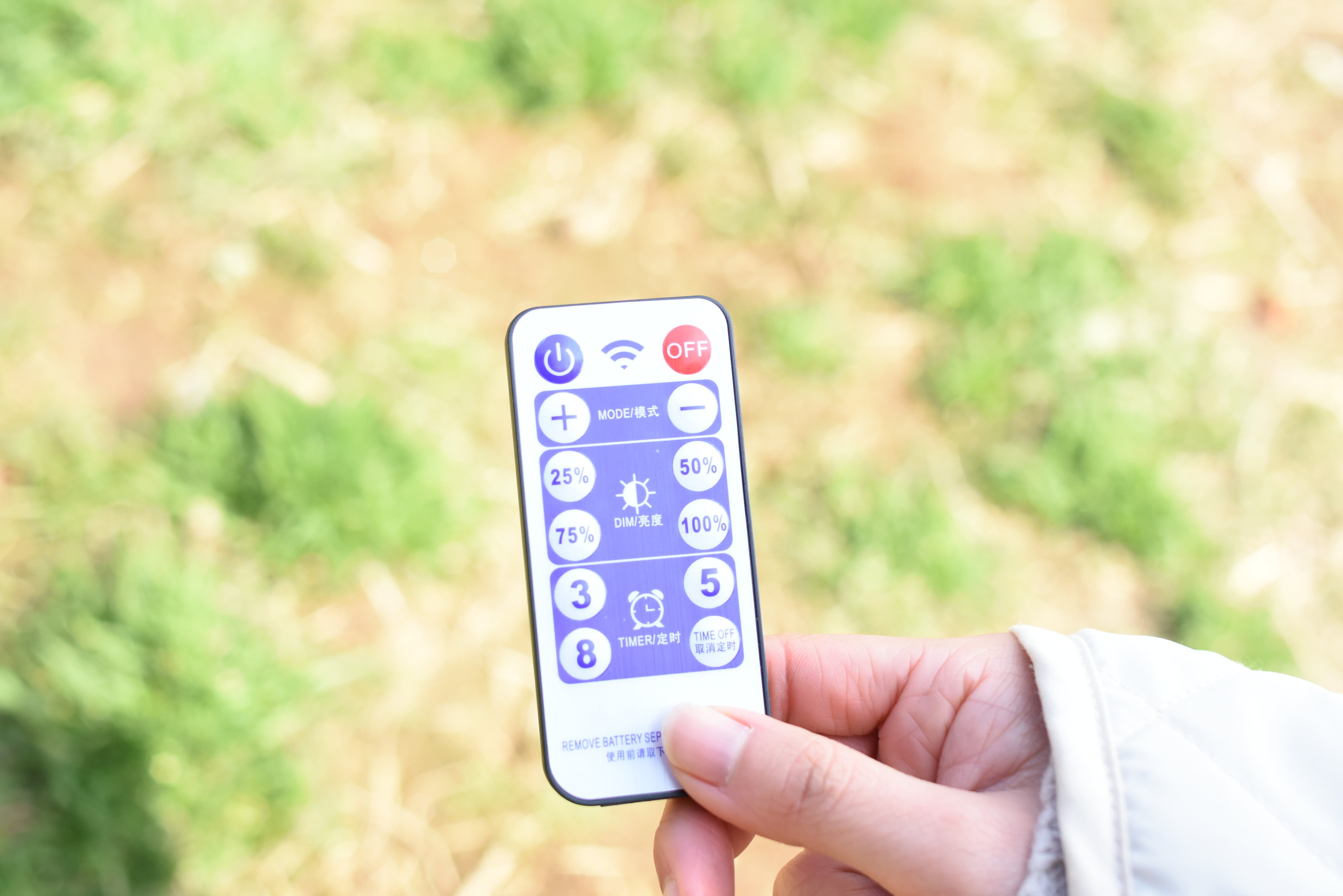 電球の大きさ、樹脂製、リモコン付き、長さです。