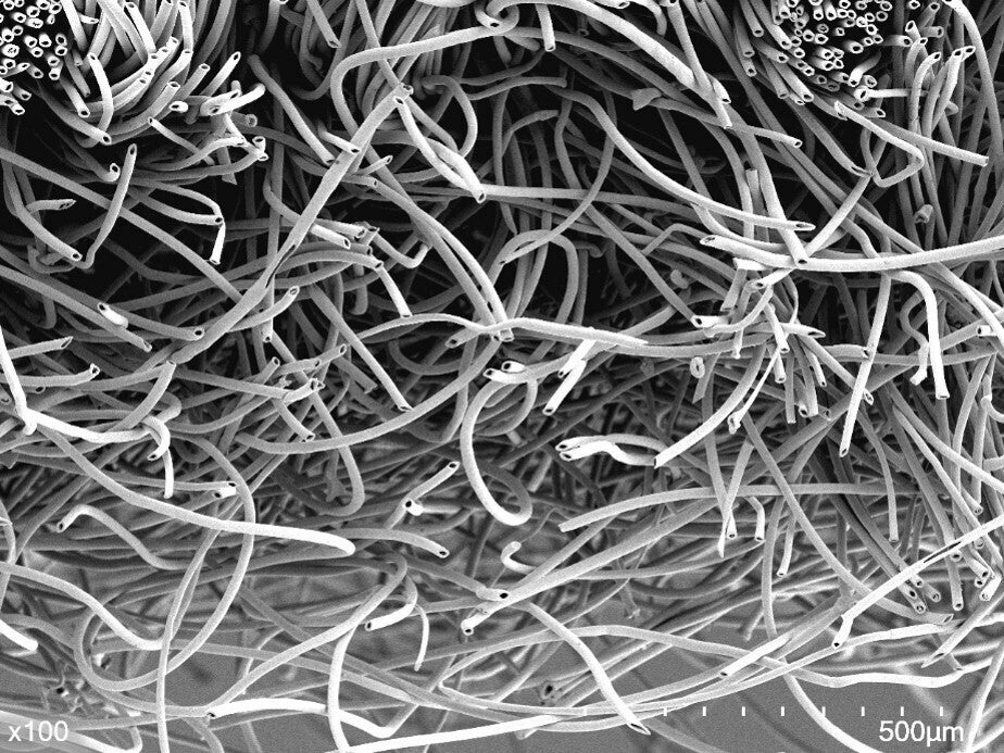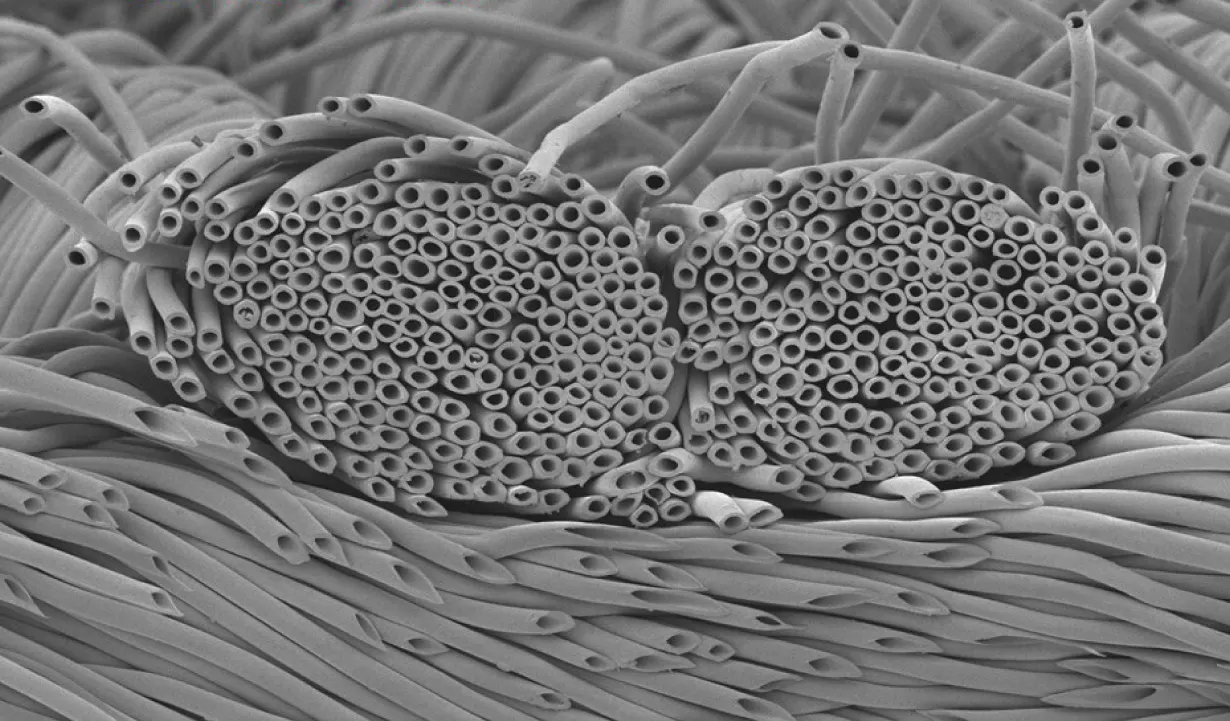 中空繊維(内部に穴の開いた繊維)自体は世の中にたくさんありますが、わたしたちが知る限り、「45%」という高い中空比率を誇る素材は、東レならではの特別なもの。そう、それはほぼ半分が空気という特別な繊維であり、日本が誇る先端技術です。